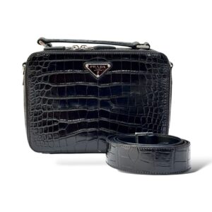 The Prada Brique Black Croco Leather Bag exudes timeless sophistication and modern edge. Crafted from luxurious crocodile-embossed leather in classic black, this bag showcases Prada’s signature structured silhouette — sleek, elegant, and effortlessly refined. Its glossy texture and subtle shine highlight the intricate croco pattern, while the polished silver hardware and iconic Prada triangle logo add a touch of understated luxury. Designed with a top handle and a detachable shoulder strap, the Brique bag offers versatile styling for both formal and casual occasions. A perfect blend of craftsmanship and contemporary design, it’s a true wardrobe essential for those who appreciate refined elegance.