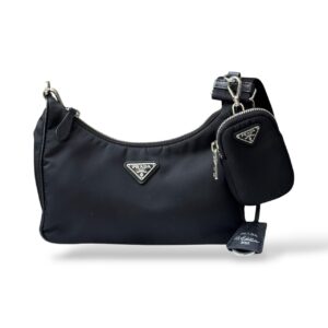 Prada Re-Edition 2005 Re-Nylon Black Bag is a modern revival of Prada’s early 2000s mini hobo-style shoulder bag, crafted from Prada’s signature Re-Nylon (recycled nylon) for sustainable luxury with black Saffiano leather trim and an enamelled triangular logo. It features a zip-top closure, detachable/adjustable strap and compact silhouette that’s perfect for everyday essentials — blending Y2K nostalgia with contemporary versatility.