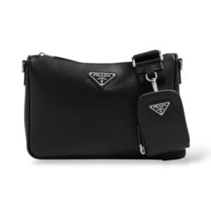 Open the pouch to reveal a surprisingly spacious interior, perfect for stashing your essentials in style. The iconic Prada logo discreetly adorns the front, a symbol of the brand’s legacy and impeccable taste.