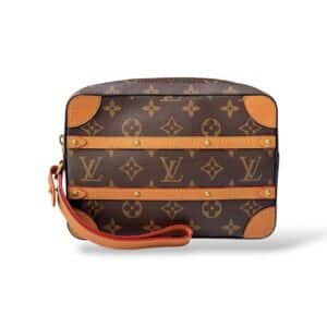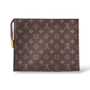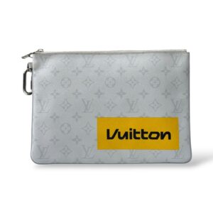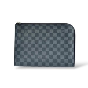 Louis Vuitton Pochette Jour PM in Damier Graphite canvas. A sleek, minimalist pouch featuring the iconic checkerboard pattern, slim silhouette, secure zip closure, and refined leather trim—ideal for carrying essentials or using as a stylish document holder.