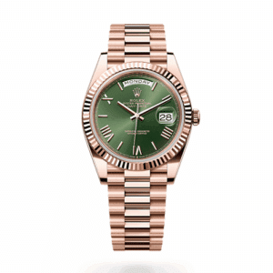 4 - Rolex, 5 - Men, 7 - Designers, 7 - Men WatchesRolex Day-Date 40mm 228235 Everose Gold Olive Green Dial Fluted Bezel President Bracelet