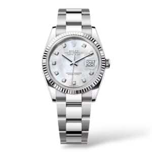Rolex Datejust 36mm 126234 Oystersteel & White Gold is an elegant classic featuring a 36 mm Oyster case in corrosion-resistant Oystersteel paired with an 18 ct white gold fluted bezel, and a white mother-of-pearl dial set with diamond hour markers that give each watch a unique iridescent look. It’s powered by Rolex’s reliable automatic Calibre 3235 movement with date at 3 o’clock and Cyclops lens, and is fitted on a robust Oyster bracelet — combining timeless style with everyday versatility and 100 m water resistance.