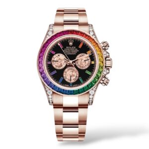 Rolex Cosmograph Daytona 40 mm crafted in 18k Everose gold, distinguished by its spectacular rainbow sapphire-set bezel with perfectly graduated sapphires, diamond-encrusted lugs, and a sleek black dial adorned with diamond hour markers. Powered by Rolex’s latest-generation automatic chronograph movement, this ultra-rare masterpiece combines high-performance motorsport heritage with exceptional gem-setting artistry and exclusivity.