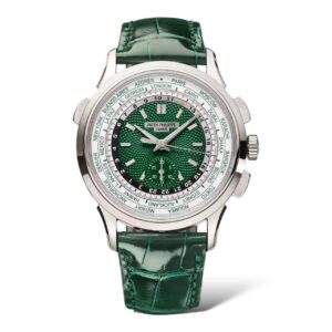 The self-winding flyback chronograph World Time Reference 5930 is offered in a brand-new version combining the brilliance of platinum with a green dial and strap – a blend of classicism and boldness that reinforces the personality of this cult model. The dial exemplifies mastery of Rare Handcrafts’ techniques with a circular, hand-guilloched decoration