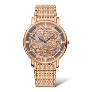 A tribute to the ancestral art of “skeletonizing”, this rose gold model is distinguished by its ultra-thin self-winding Caliber 240, entirely openworked, decorated and engraved by hand, with the engraving work alone requiring almost 130 hours. A technical and aesthetic feat in equal measure. The off-centered mini-rotor is engraved with the Patek Philippe Seal.