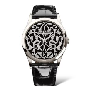 Hand-engraved and enameled decoration with its volutes and arabesques adorning the hand-engraved and enameled gold dial, this platinum Calatrava combines understated design with refined craftsmanship. Its accuracy is ensured by an ultra-thin self-winding movement visible through the transparent sapphire case-back. The shiny black alligator strap features a hand-engraved pin buckle.