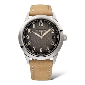 A fine example of Patek Philippe’s creativity, this Calatrava features a charcoal gray dial with a black-gradient rim and a grainy texture reminiscent of vintage camera cases. The caseband features the Manufacture’s emblematic hobnail pattern. This model is powered by a self-winding movement with stop-seconds function.
