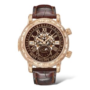 Patek Philippe has reaffirmed its supreme mastery of the music of time by introducing to its current collection a wristwatch featuring a grande sonnerie – the ultimate acoustic function – complemented by a petite sonnerie and minute-repeater. This technical feat is housed in an elegant platinum case with a black Grand Feu enamel dial.