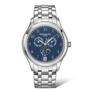 Patek Philippe offers its famous Annual Calendar in a 38 mm-diameter steel case to suit all wrists, paired with an integrated five-row bracelet. The shimmer of polished steel blends with an elegant midnight blue dial enhanced by vertical and horizontal satin-brushing. The day/date/month calendar requires only one manual correction per year.