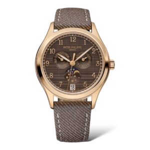 A reinterpretation of the Patek Philippe Annual Calendar, this rose gold model features a 38 mm diameter designed to suit all wrists. The warm shade of rose gold combines elegantly with the brown dial enhanced by a double vertically and horizontally satin-brushed finish reminiscent of raw shantung silk fabrics, as well as the brown calfskin strap with denim pattern.