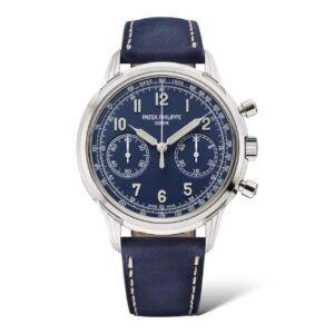 The quintessential men’s chronograph, this model features a white gold case with round guilloched pushers and three-tier lugs, framing an elegant, perfectly legible blue dial. The movement features traditional construction (column wheel, horizontal clutch, manual winding) combined with six patented innovations.
