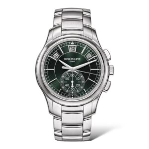 A rare example of a Patek Philippe complicated watch in steel, this self-winding flyback chronograph with Annual Calendar radiates a resolutely sporty look. The visually rhythmical sunburst dial features an elegantly casual olive green hue. The integrated bracelet is enhanced by contrasting polished and satin-brushed finishes. The Annual Calendar requires only one correction per year.