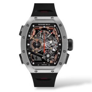 A bold and technical timepiece featuring a manual-winding movement with an integrated tourbillon and split-seconds chronograph, inspired by Ferrari’s performance ethos. Housed in a cutting-edge Richard Mille case with distinctive automotive design cues, this watch combines ultra-high precision with dynamic aesthetics, perfect for enthusiasts of motorsport engineering and haute