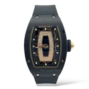 The Richard Mille RM07-01 is a striking timepiece defined by its 45mm black ceramic case. Its openworked dial, accented with diamonds, reveals the intricate mechanics within. A fusion of high-performance materials and avant-garde design, this watch is a testament to Richard Mille’s horological mastery