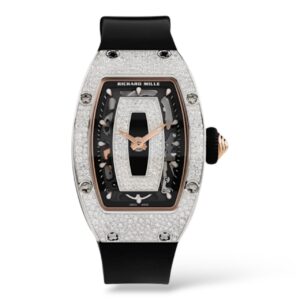 The Richard Mille RM 07-01 Rose Gold Onyx Snow Diamond Set combines the elegance of rose gold with the striking contrast of a polished onyx dial, enhanced by a dazzling snow-set diamond bezel. The intricate snow-set diamonds create a sparkling effect, elevating the watch’s luxury appeal. This limited edition timepiece offers a rare fusion of sophisticated materials and exceptional craftsmanship, making it a coveted piece for collectors who appreciate both beauty and exclusivity.