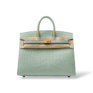 The Hermès Birkin 20 in Vert d’Eau (Water Green) is a stunning and ultra-luxurious handbag crafted from exotic crocodile leather. Its delicate pastel green hue, Vert d’Eau, exudes elegance and sophistication, making it a standout piece in any collection.