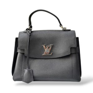 Louis Vuitton LockMe Ever BB Bag in black grained leather. A chic, compact handbag featuring the signature LV turn-lock, structured silhouette, top handle, and a detachable shoulder strap—perfect for elegant day-to-night wear.ardware—perfect for everyday luxury and hands-free style.