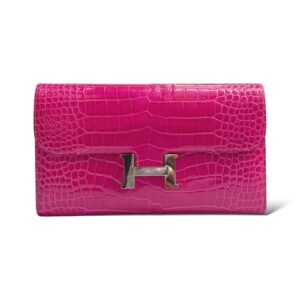 A luxurious long wallet crafted from premium alligator leather in the elegant Rose Sheherazade color. Features Palladium Hardware (PHW) and the signature Hermès Constance clasp. Sleek, timeless, and perfect for sophisticated everyday use