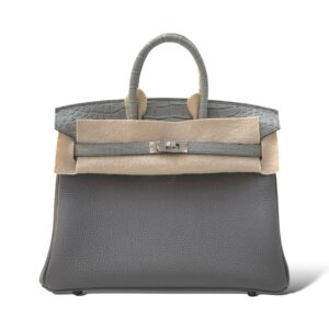 The **Hermès Birkin 25 in Gris Ciment/Gris Meyer Touch Crocodile with Palladium Hardware (PHW)** is an exceptional and luxurious piece, blending Hermès’ signature craftsmanship with a unique combination of materials. This Birkin features soft Gris Ciment (cement gray) Swift leather with refined Gris Meyer (gray) crocodile accents on the top flap, handles, and clasp, creating a subtle yet striking contrast. The palladium hardware adds a sleek, modern touch to the elegant gray tones. Compact at 25 cm, this Birkin is perfect for daily essentials while making a sophisticated statement, offering a blend of timeless style and exotic allure for the discerning collector.
