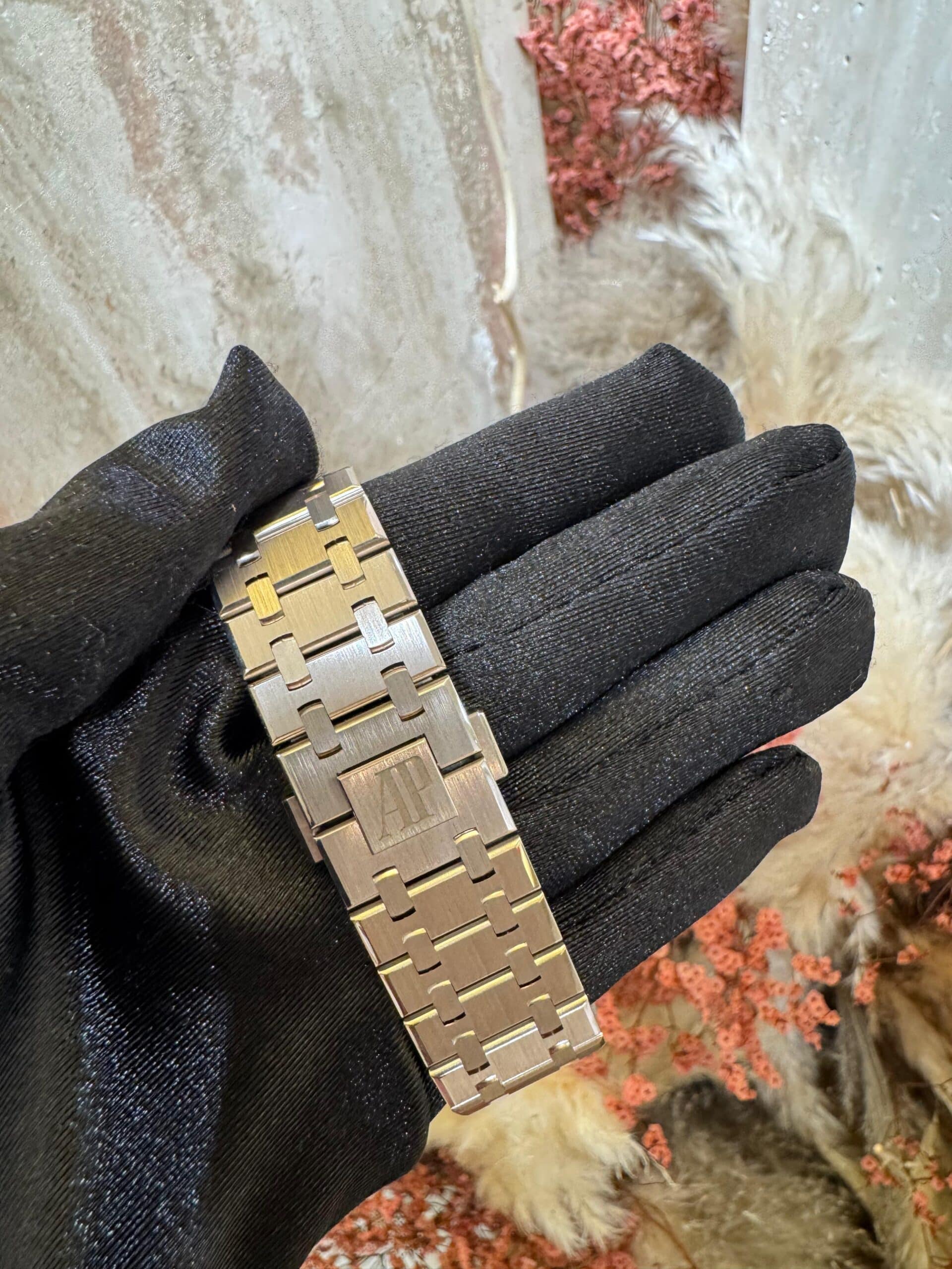 The Audemars Piguet Royal Oak Perpetual Calendar is a timepiece crafted in 18-carat sand gold, featuring a sand gold-toned “Grande Tapisserie” dial with matching subdials and white gold hour markers. Powered by the selfwinding Calibre 7138, it offers a perpetual calendar with day, date, month, leap year, week number, and moon phase functions, all adjustable via the crown.