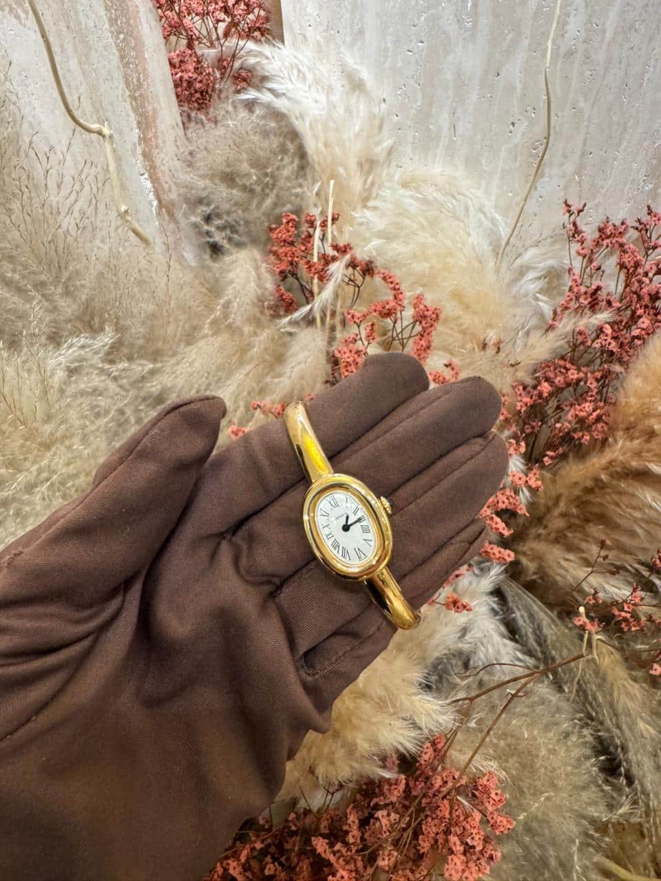 This exquisite timepiece features a sleek and slender yellow gold case, evoking a sense of understated glamour and refinement. The distinctive oval shape of the case, reminiscent of a luxurious bathtub (“baignoire” in French), adds a touch of whimsy to its classic design.