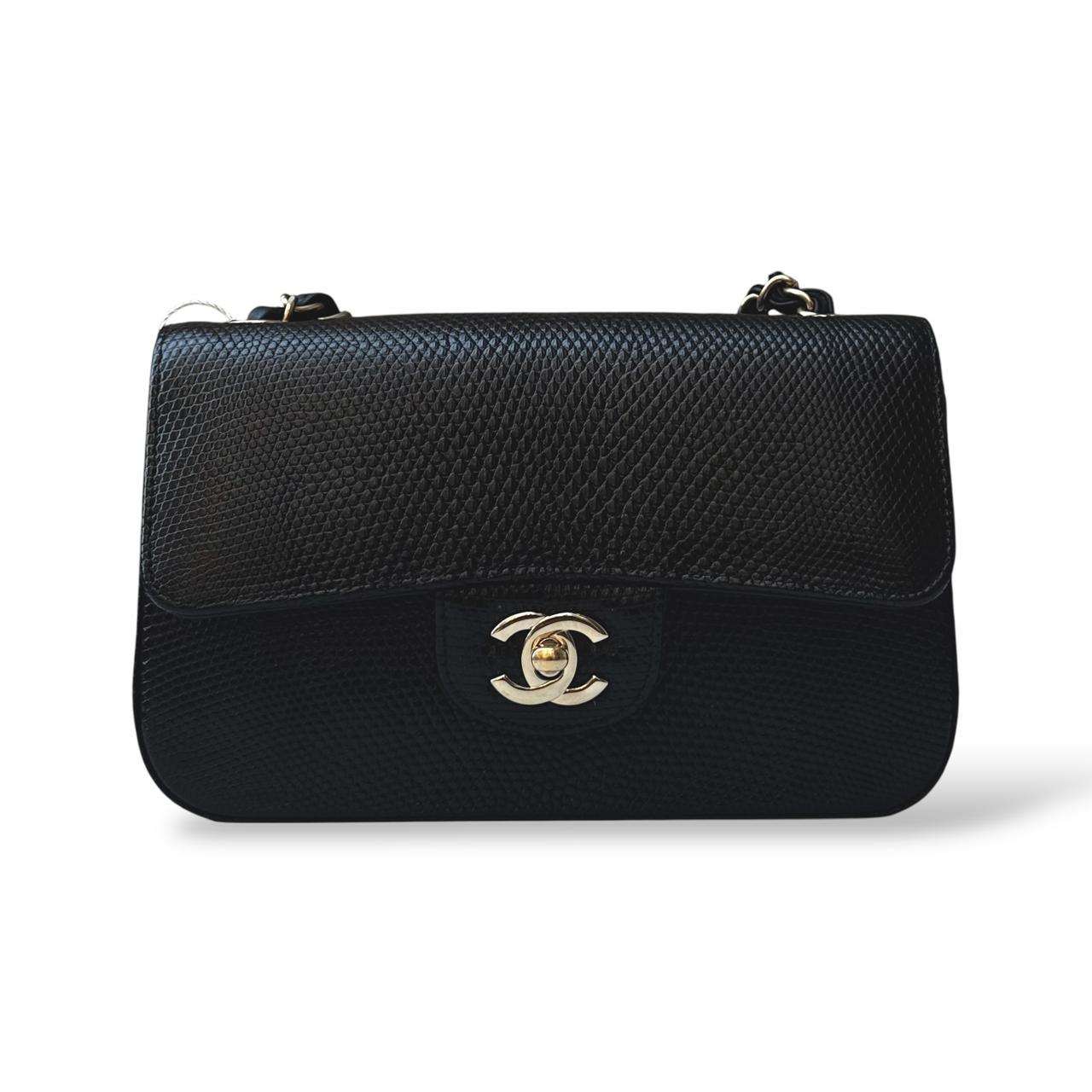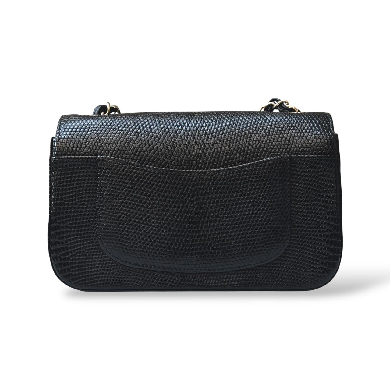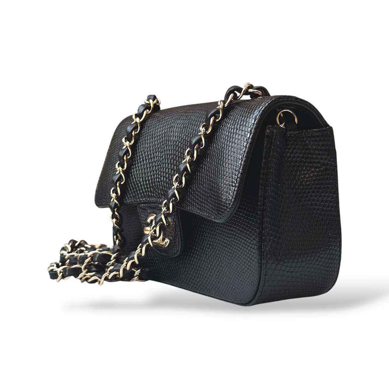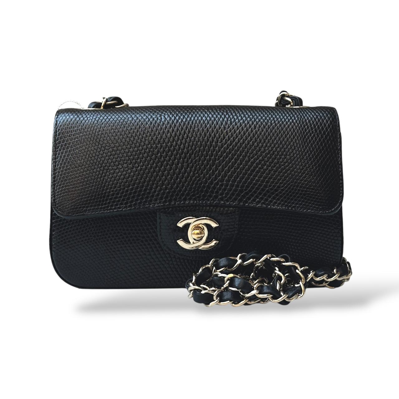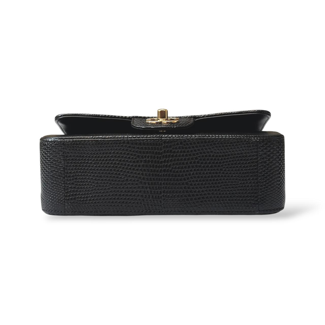 The Chanel Classic Mini Flap Bag in black lizard leather is a timeless and elegant statement piece. It features luxurious gold hardware that beautifully complements the exotic texture of the leather. Compact yet sophisticated, it’s perfect for both evening occasions and refined everyday wear.