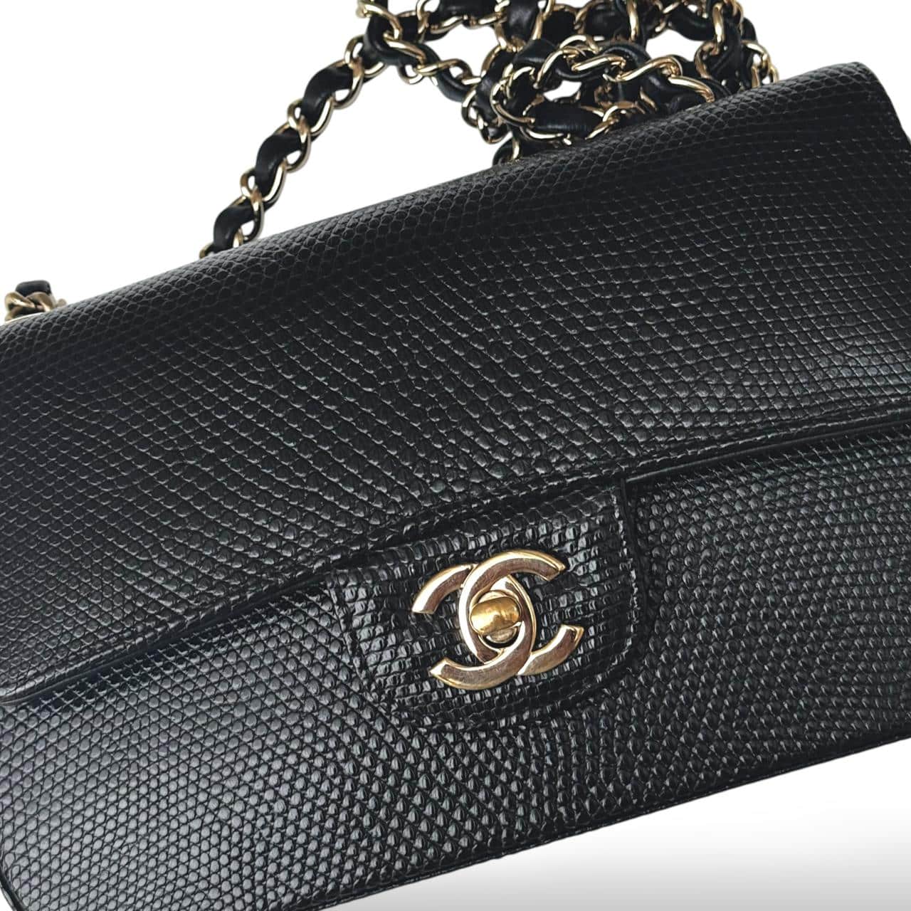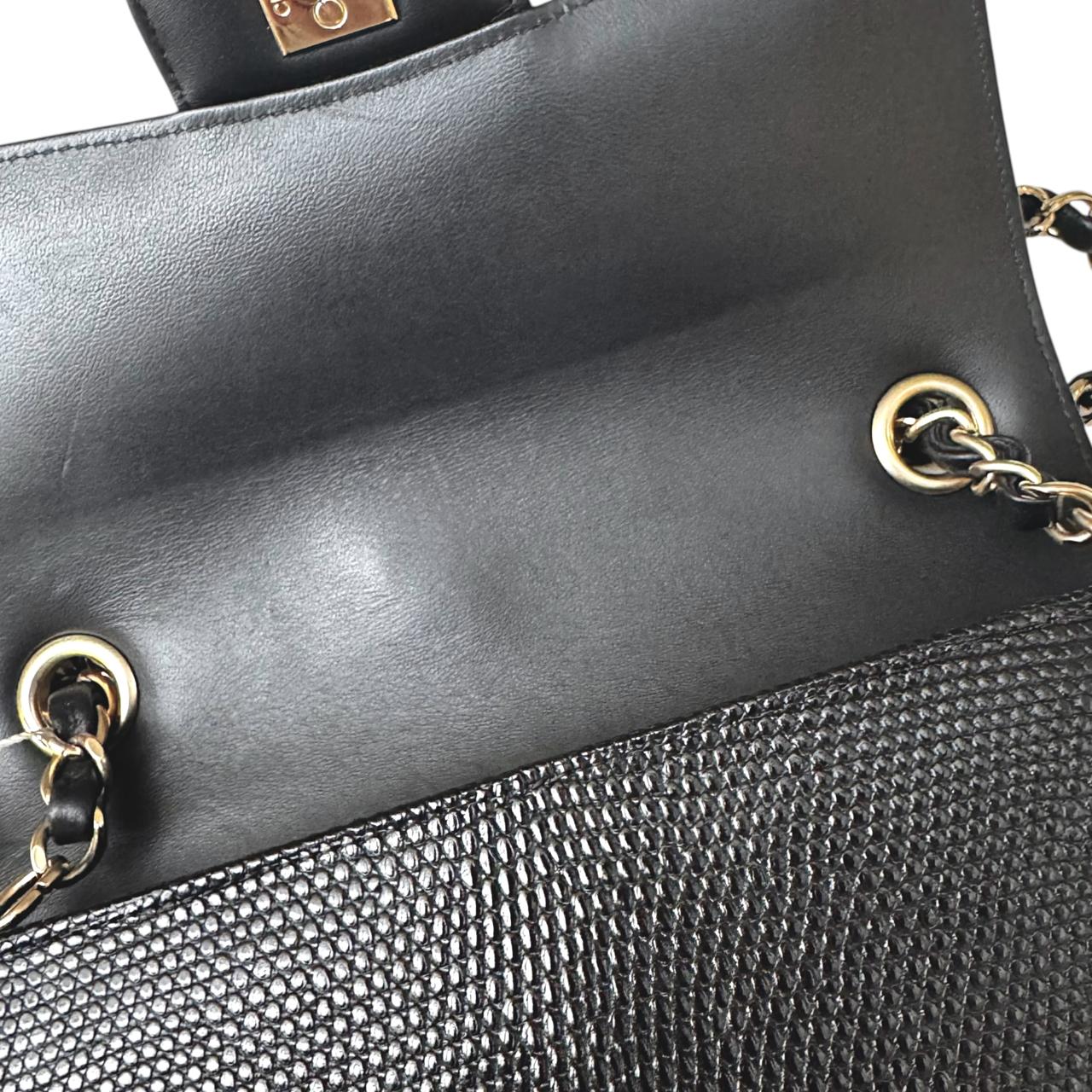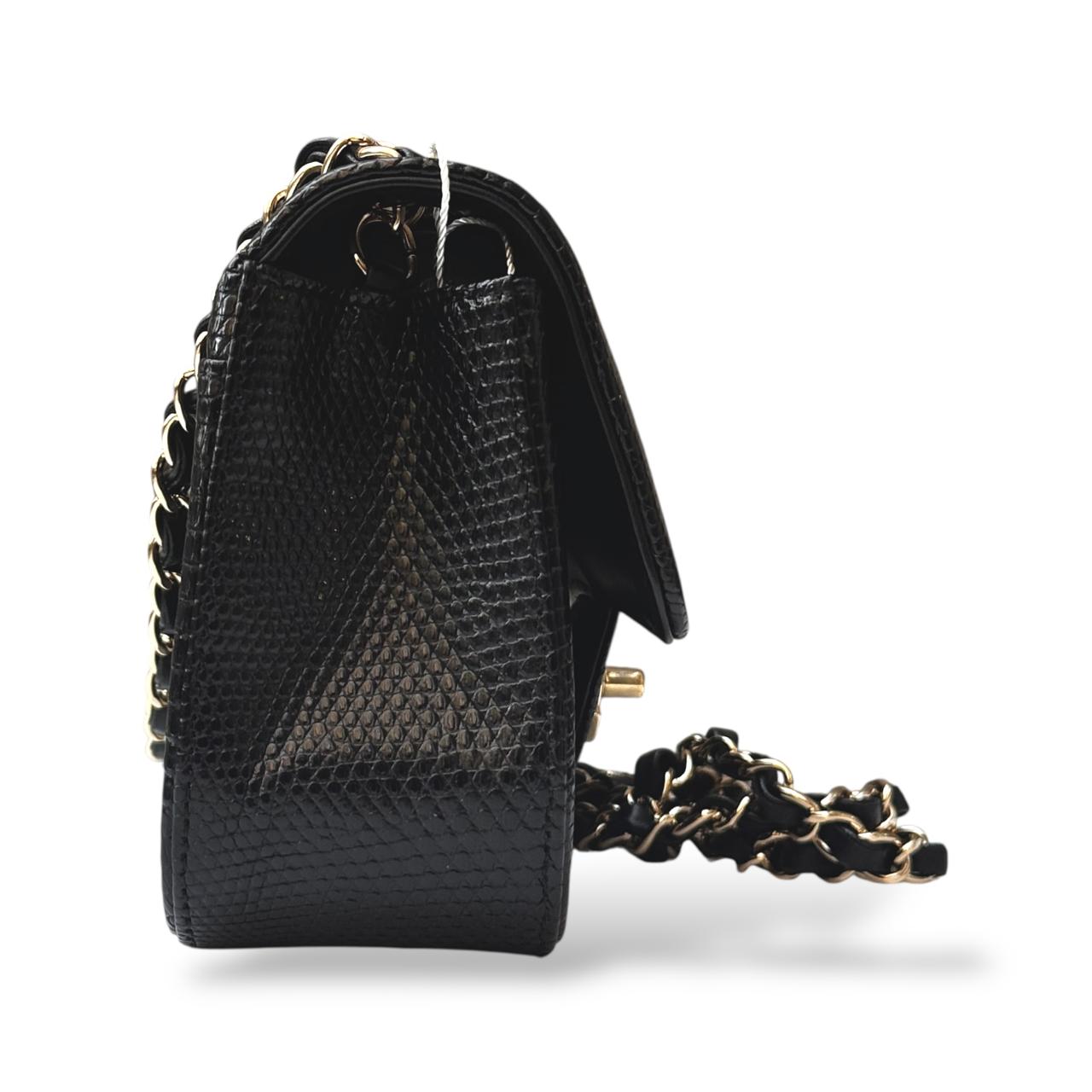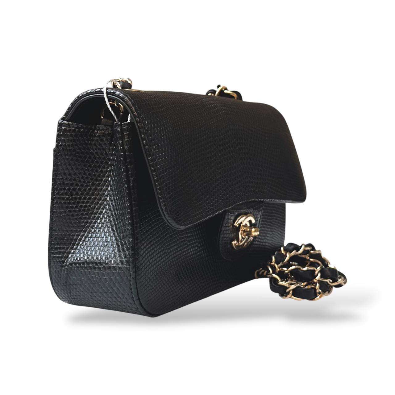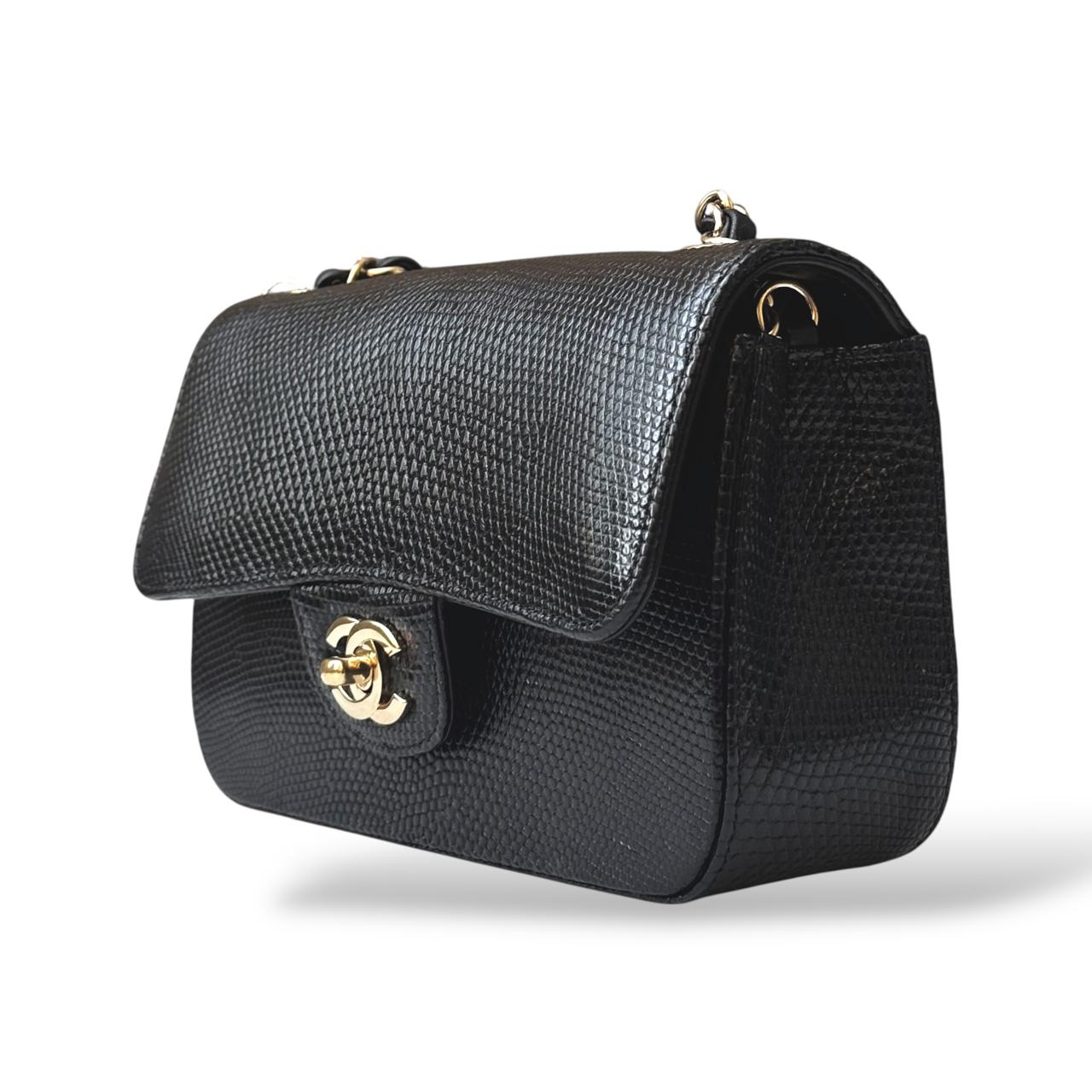 The Chanel Classic Mini Flap Bag in black lizard leather is a timeless and elegant statement piece. It features luxurious gold hardware that beautifully complements the exotic texture of the leather. Compact yet sophisticated, it’s perfect for both evening occasions and refined everyday wear.