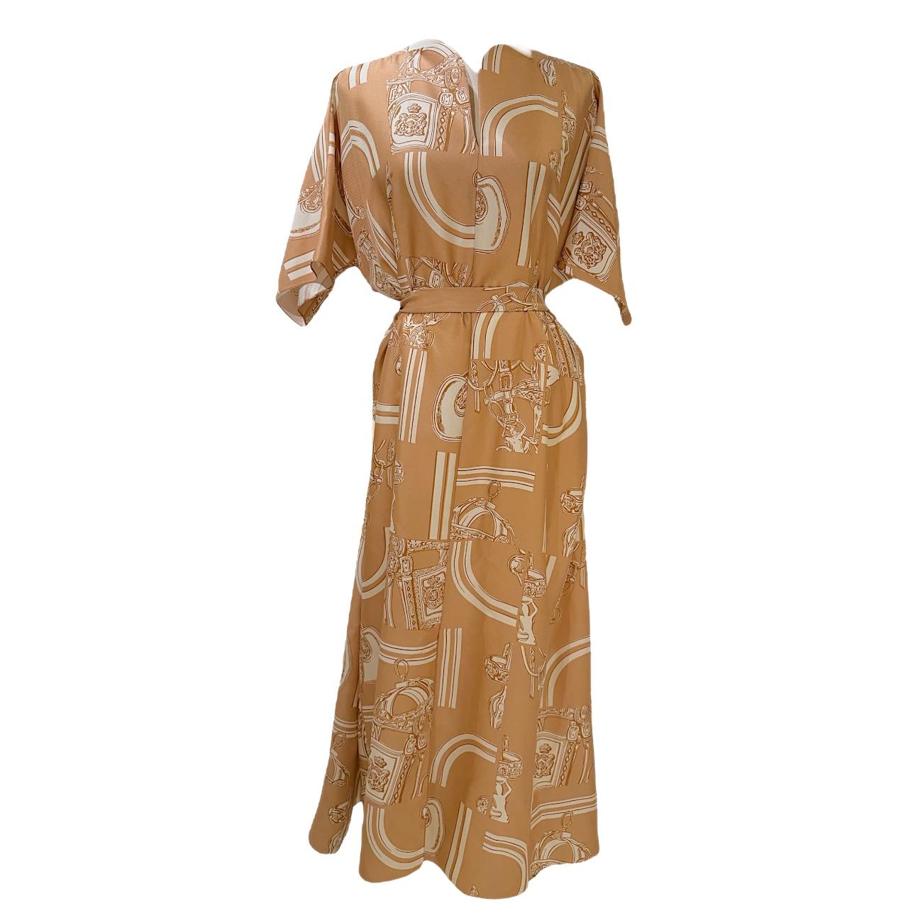An elegant and relaxed silhouette, this Hermès belted caftan is crafted in soft beige fabric adorned with subtle white patterns. Designed with a waist belt for a flattering fit, it blends effortless sophistication with timeless comfort.