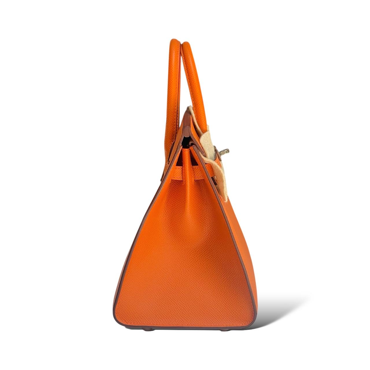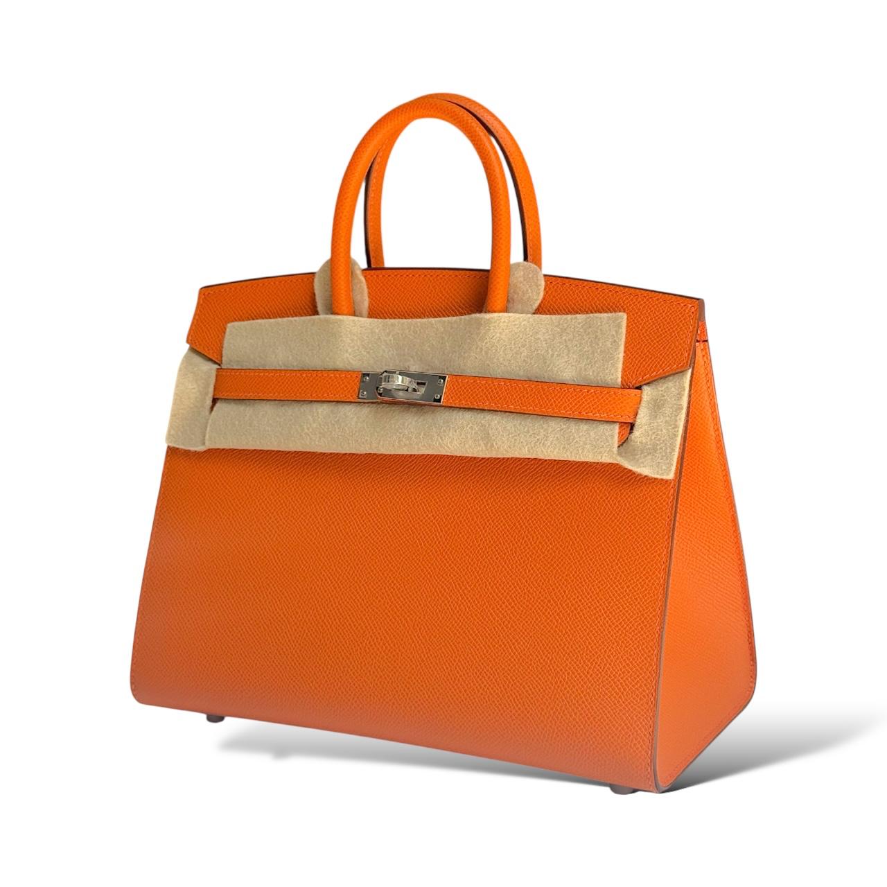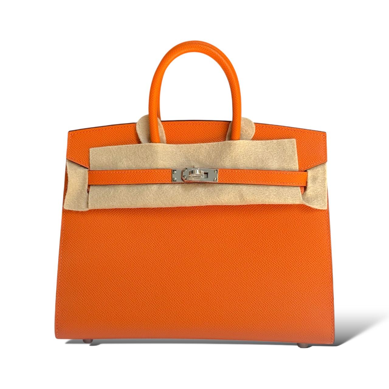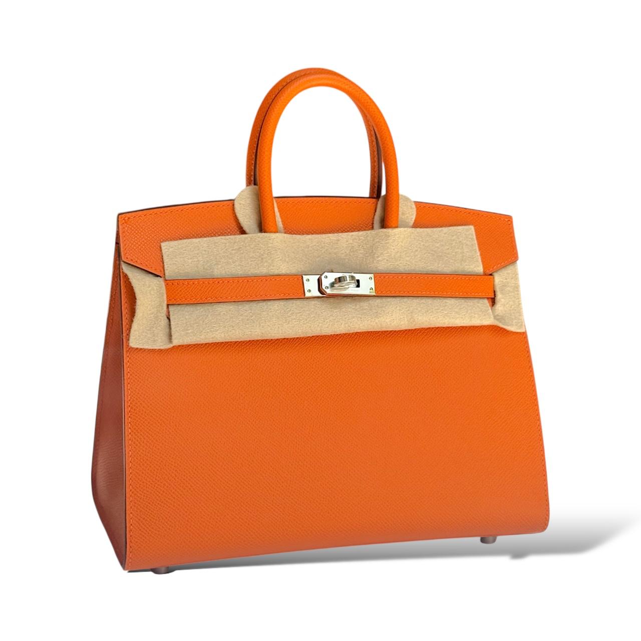 A vibrant and iconic statement piece, this Birkin 25 is crafted from durable and lightweight Epsom leather in Hermès’ signature Orange, symbolizing timeless elegance and bold sophistication. Accented with sleek Palladium hardware, it features the classic Birkin design with double rolled handles, a flap top with turn-lock closure, and protective metal feet. The compact 25cm size offers versatility, making it perfect for both daytime chic and evening elegance, while the structured Epsom leather ensures lasting shape and beauty.