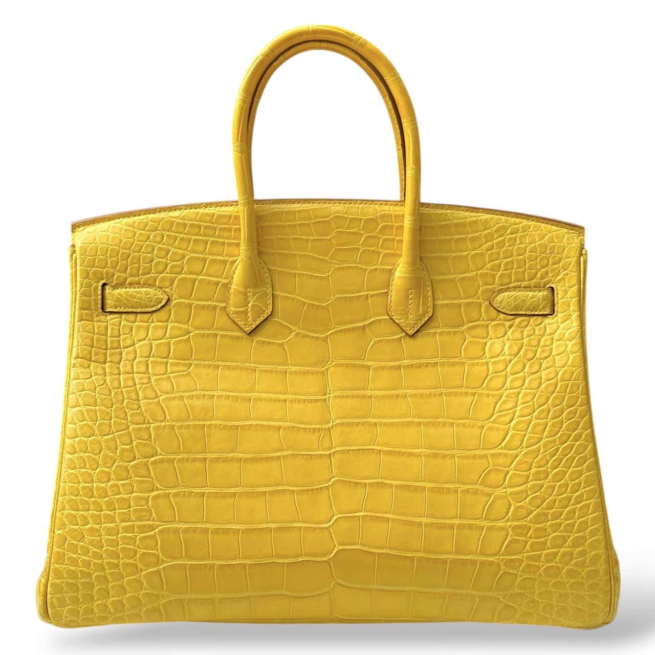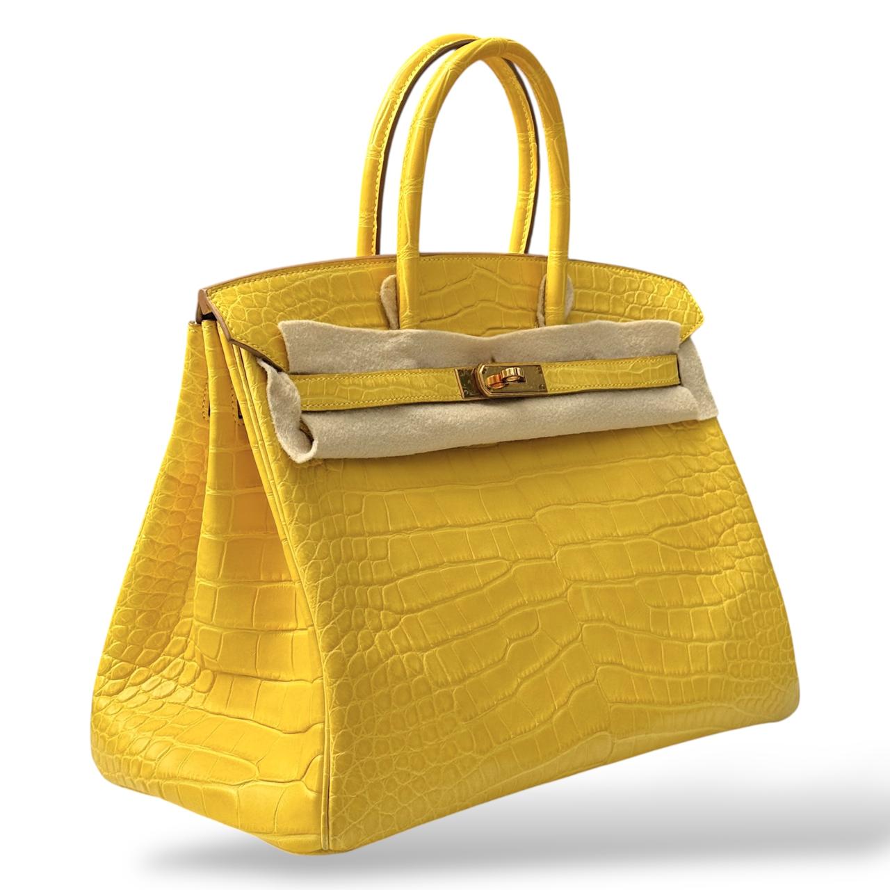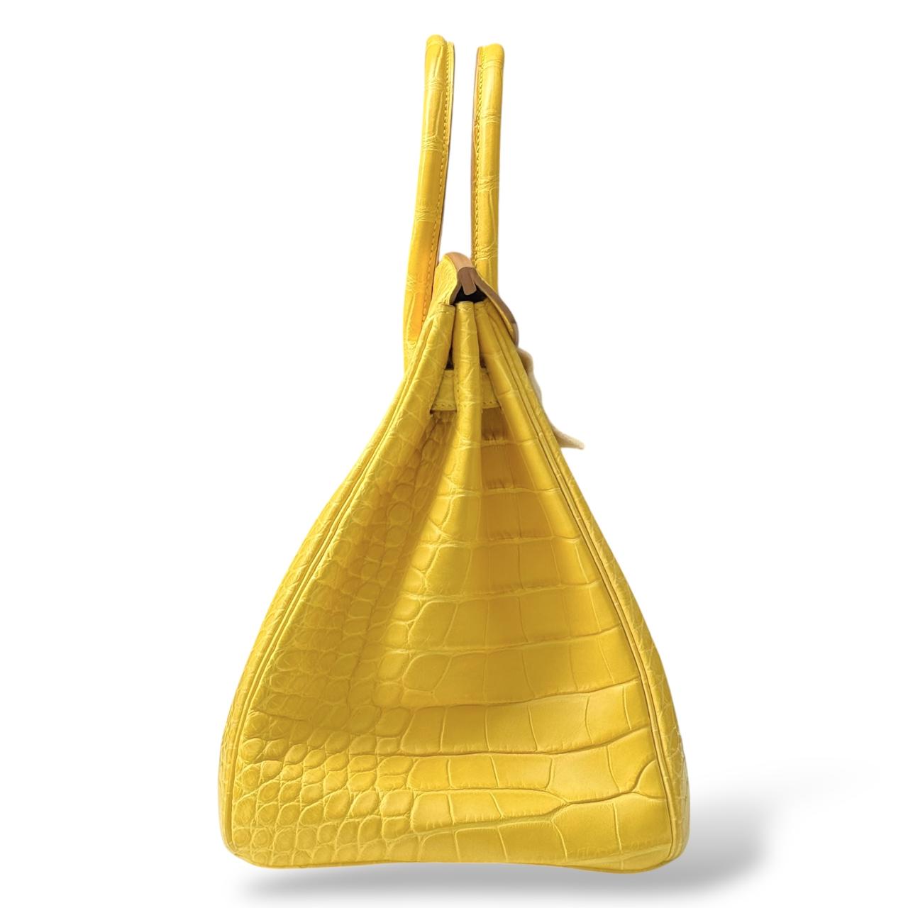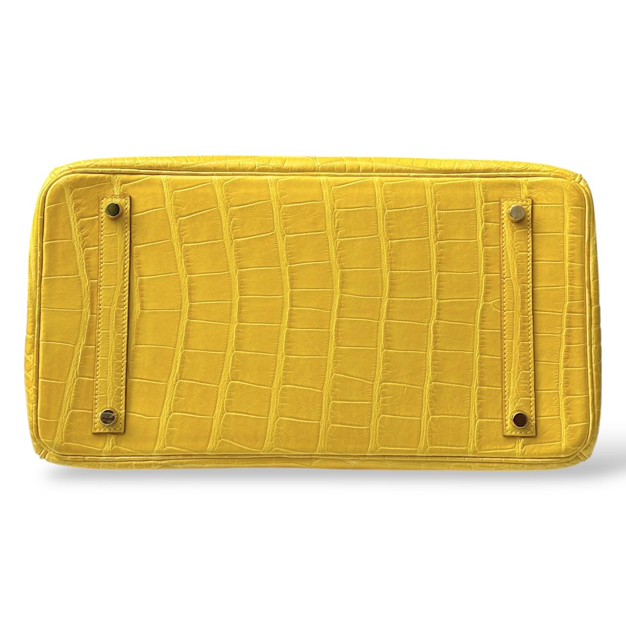 A stunning Hermès Birkin in size 35, crafted from luxurious Alligator leather in the vibrant Mimosa yellow color. This elegant and highly collectible piece features Gold Hardware (GHW), enhancing its classic and structured silhouette. A timeless statement bag showcasing exceptional Hermès craftsmanship. Comes as a full set with original packaging and accessories.
