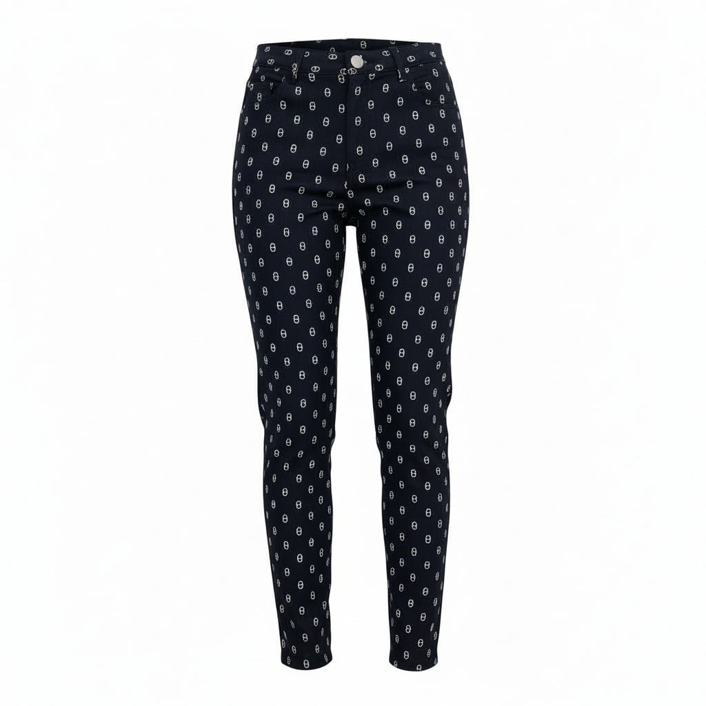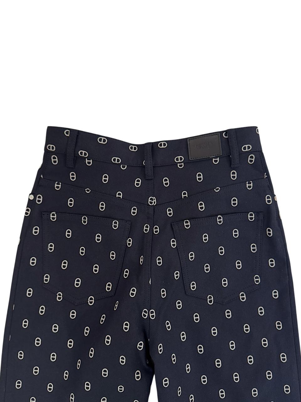 Elegant straight-leg pants in Hermès’ signature “Chaîne d’Ancre” printed cotton H canvas in Bleu Marine, crafted in Italy from a soft stretch blend (98 % cotton, 2 % elastane). They feature palladium-plated Clou de Selle hardware, front pockets, a zip and button closure, and a back yoke in Hermès Paris-embossed calfskin. The piece runs true to size and pairs beautifully with both casual and refined looks.