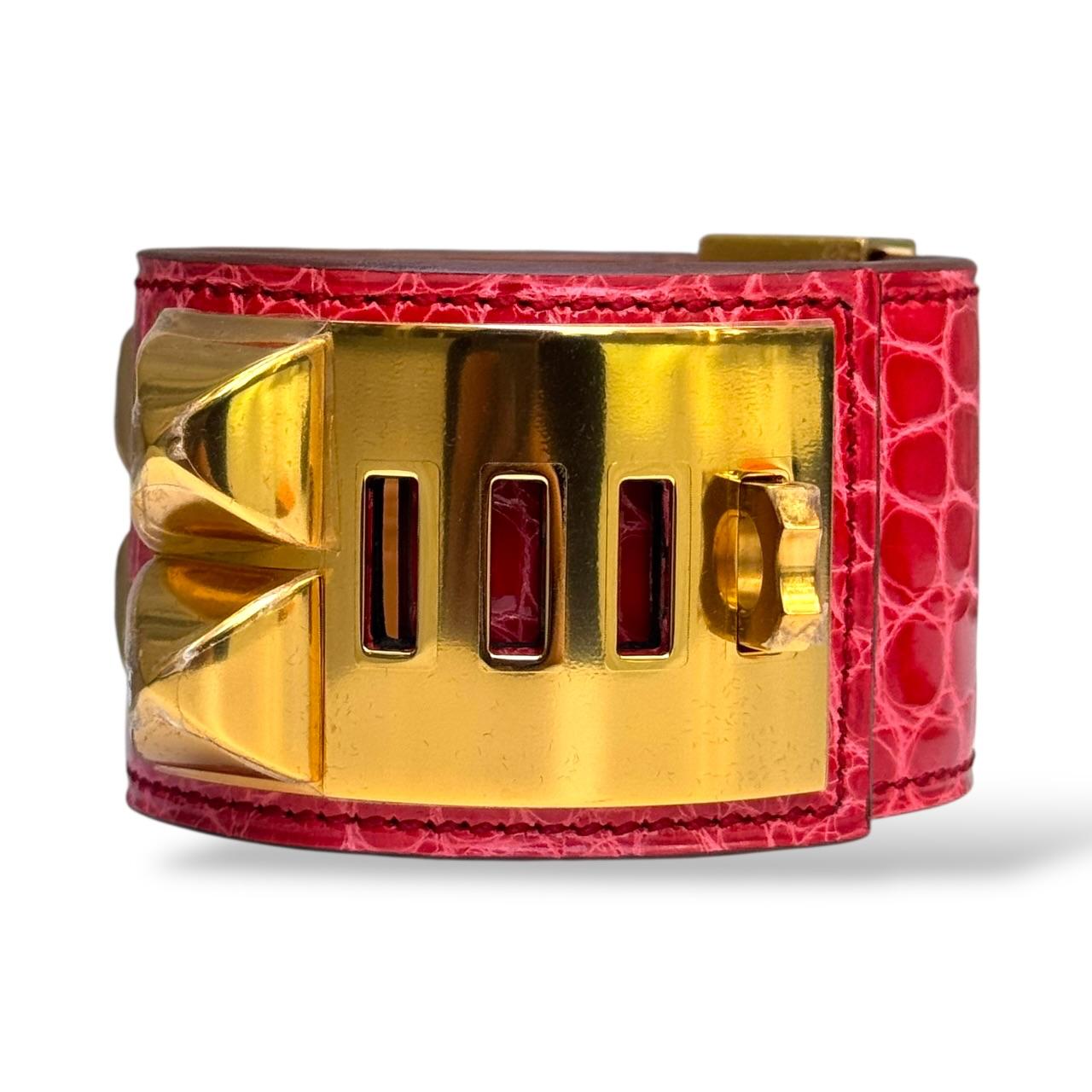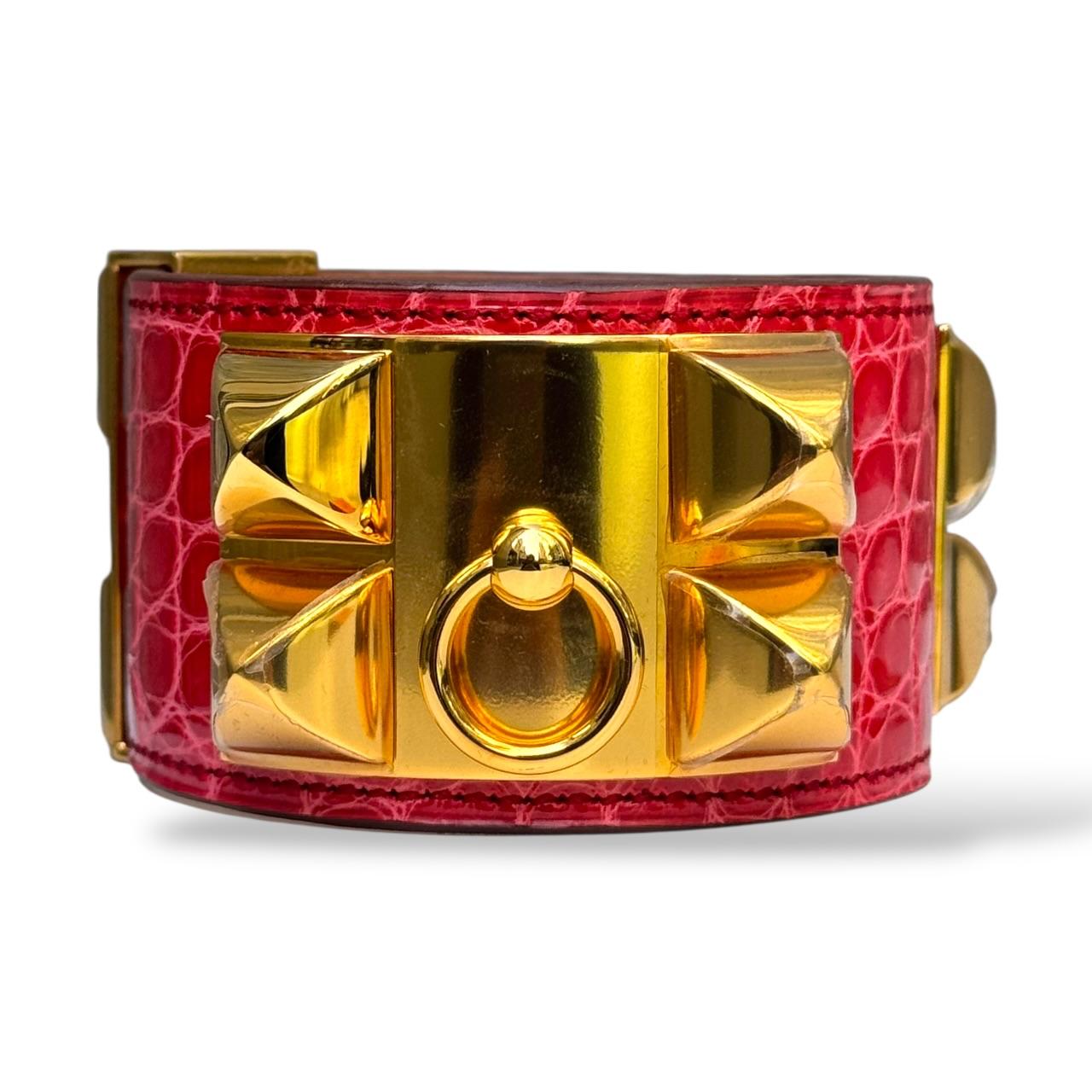 luxurious statement cuff in bougainvillier-pink alligator leather with gold-tone hardware (GHW), featuring Hermès’ iconic Collier de Chien pyramid studs and central ring. This bold, equestrian-inspired design pairs rich exotic texture with refined craftsmanship for an eye-catching accessory.