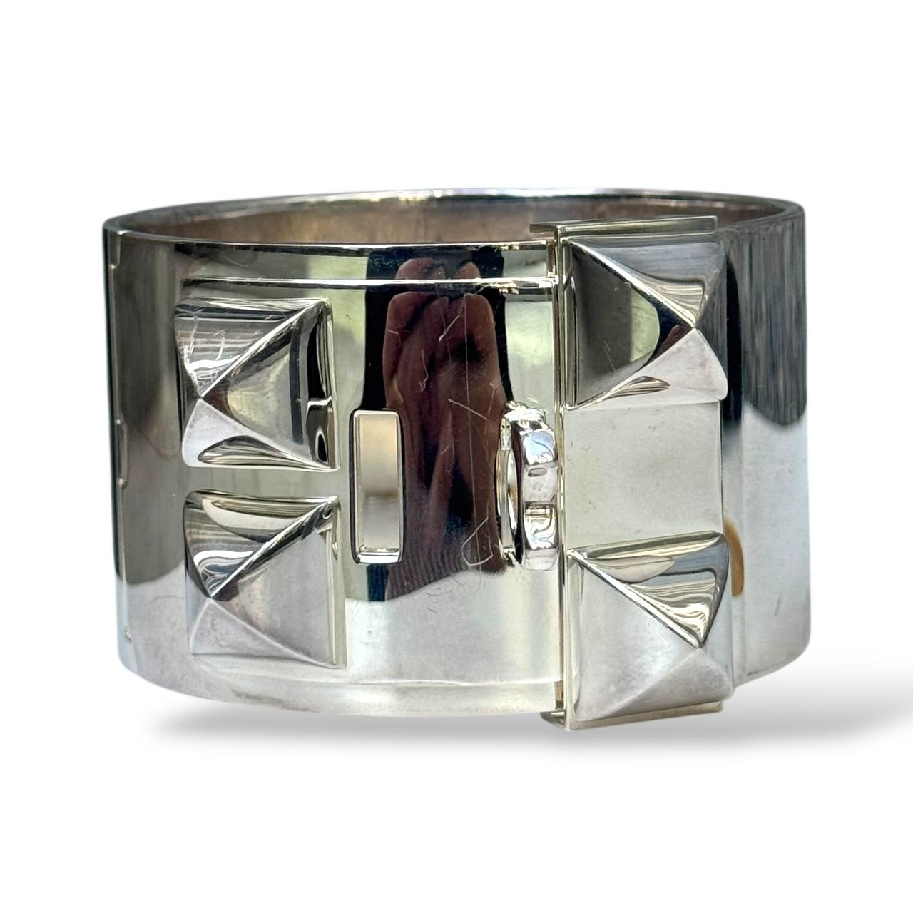 A bold, sculptural cuff crafted from high-polish sterling silver with the iconic Collier de Chien silhouette, featuring prominent pyramid studs and signature ring detail. Its striking architectural design and XL size make it a standout statement piece that blends edgy equestrian heritage with refined luxury.