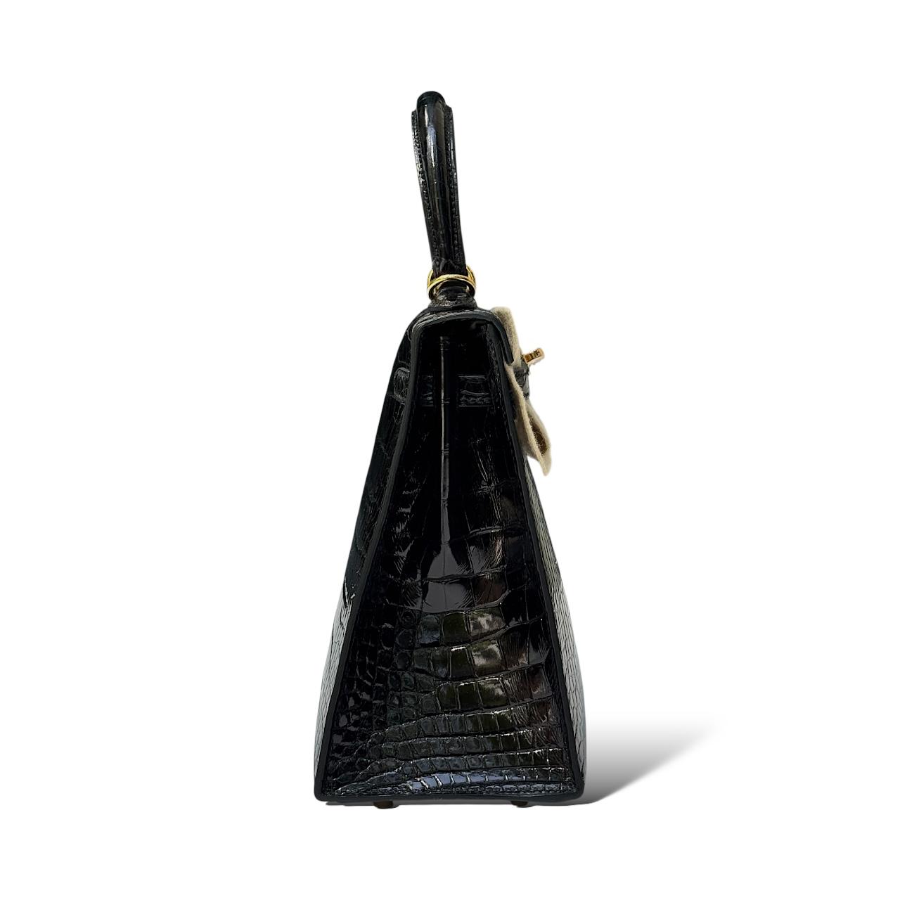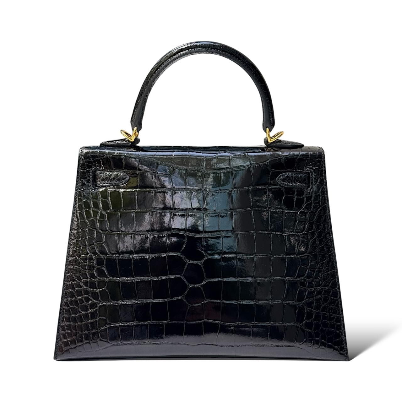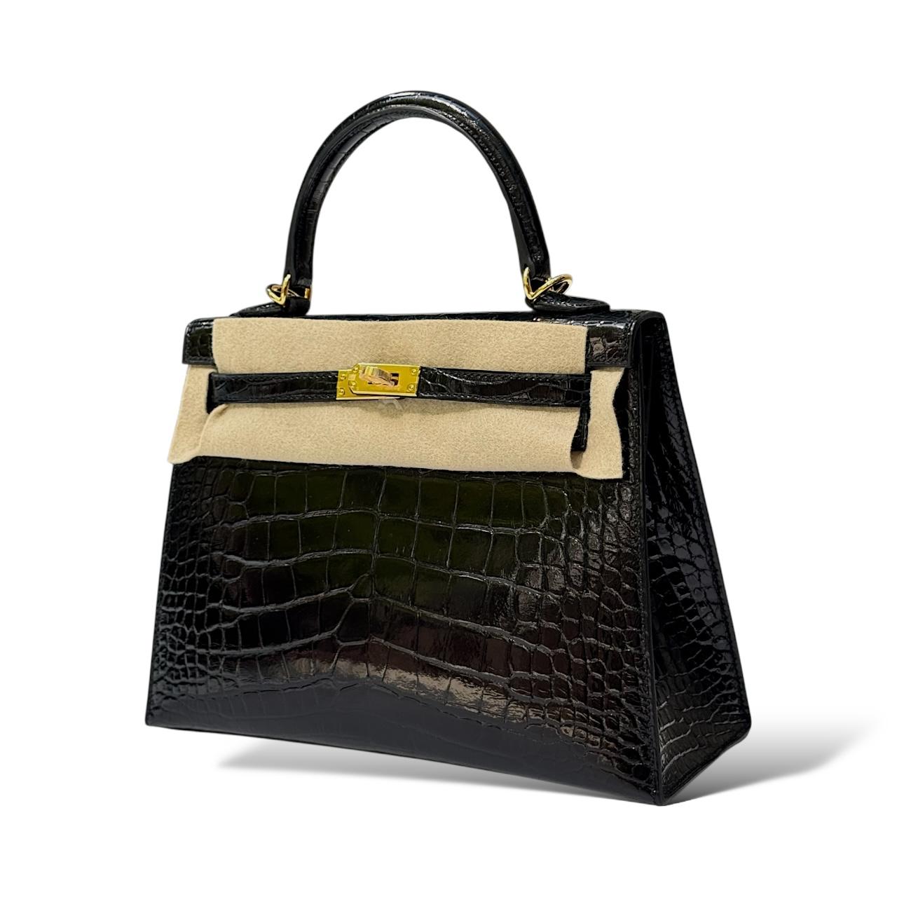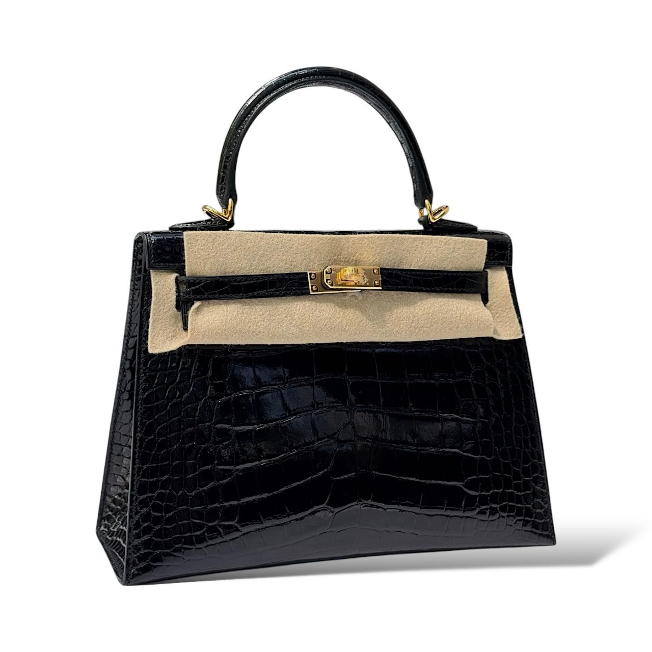 A pinnacle of luxury craftsmanship, this Kelly 25 is rendered in lustrous shiny crocodile skin in classic black, featuring radiant gold hardware (GHW). With its signature Kelly silhouette — top handle, flap-over design, turn-lock closure, and protective metal feet — it balances elegance and structure in a compact 25 cm size, ideal for both day and evening wear.