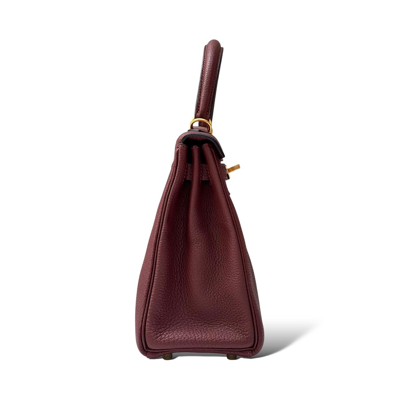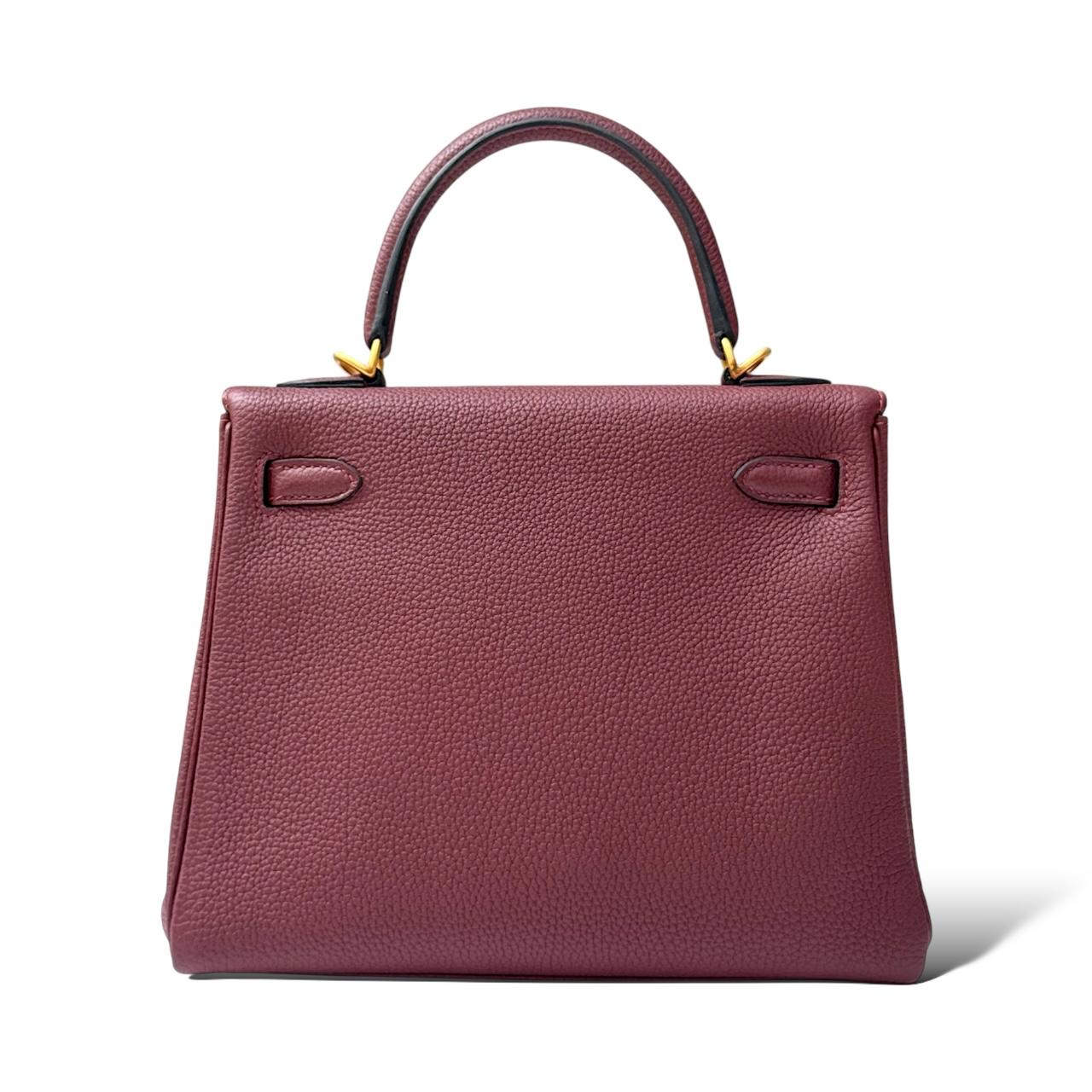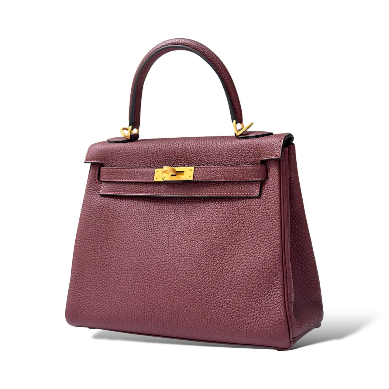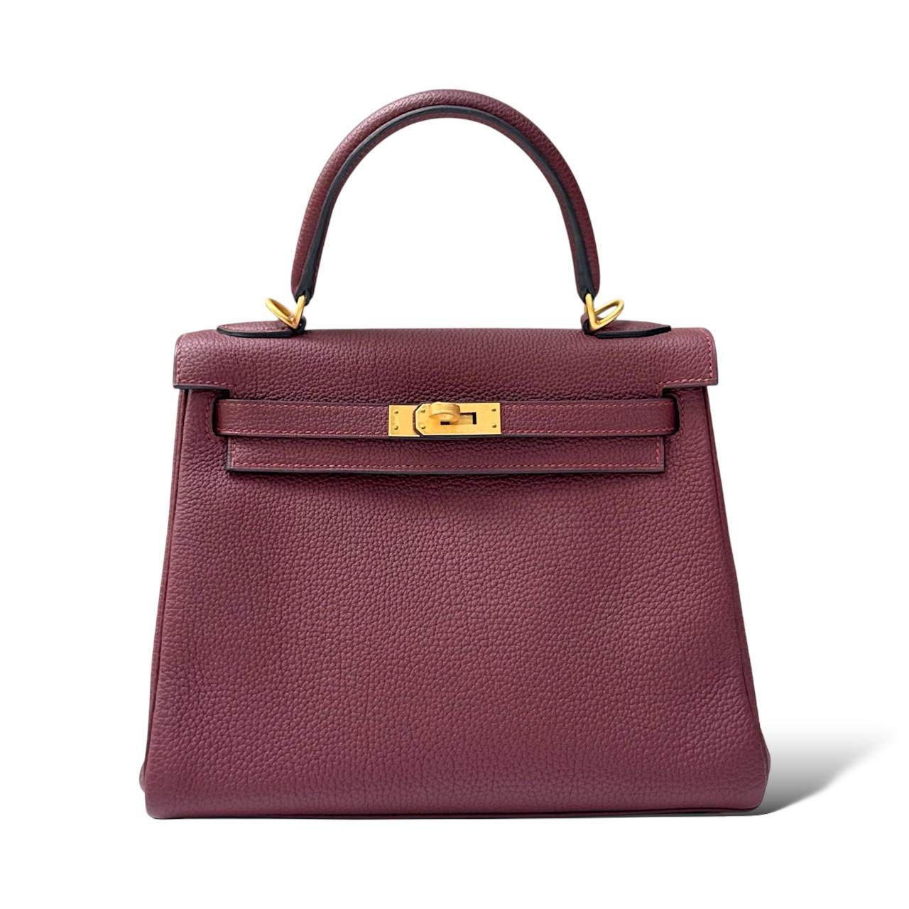 A compact 25 cm Kelly made from Togo leather in the rich Rouge H shade — a deep, warm burgundy-red with brown undertones. The pebbled Togo leather gives the bag a soft grain and a structured yet lightweight feel. It’s paired with brushed gold-tone hardware, which adds a subtle, elegant warmth without being too shiny. Features include a top handle, turn-lock closure, protective feet, and a matching leather-lined interior.