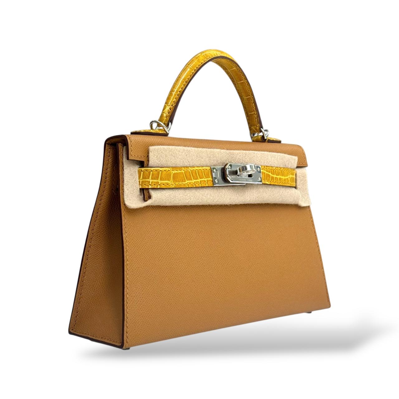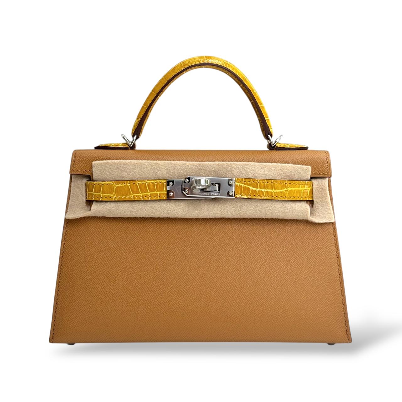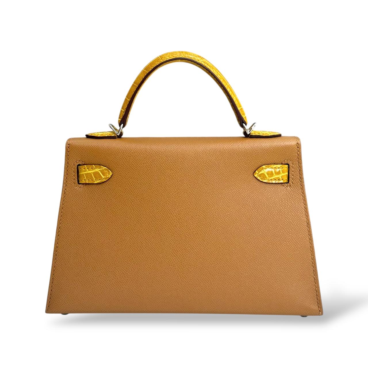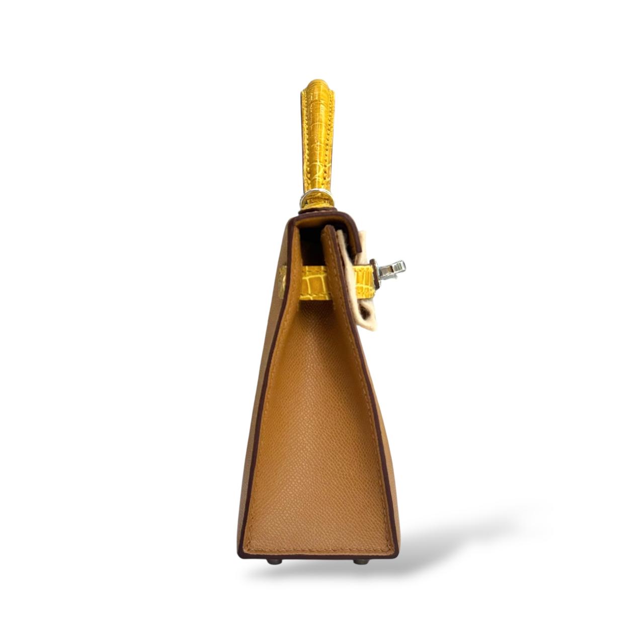 Hermès Kelly Mini SO in Sesame and Jaune Ambre, crafted from smooth Veau leather with subtle Alligator touch detailing and finished with palladium hardware (PHW), combining timeless elegance, exceptional craftsmanship, and collectibility.