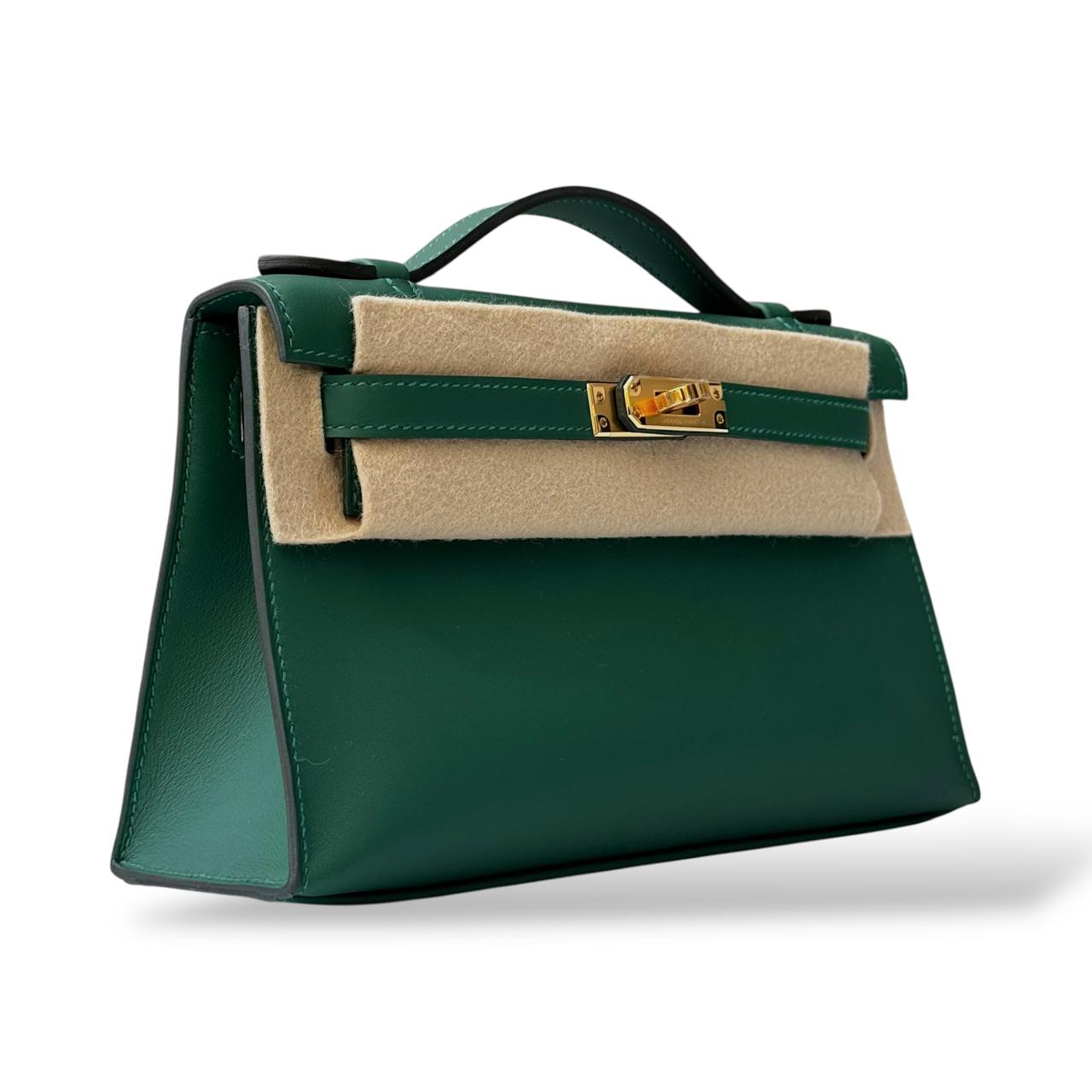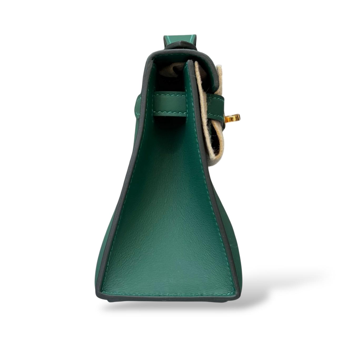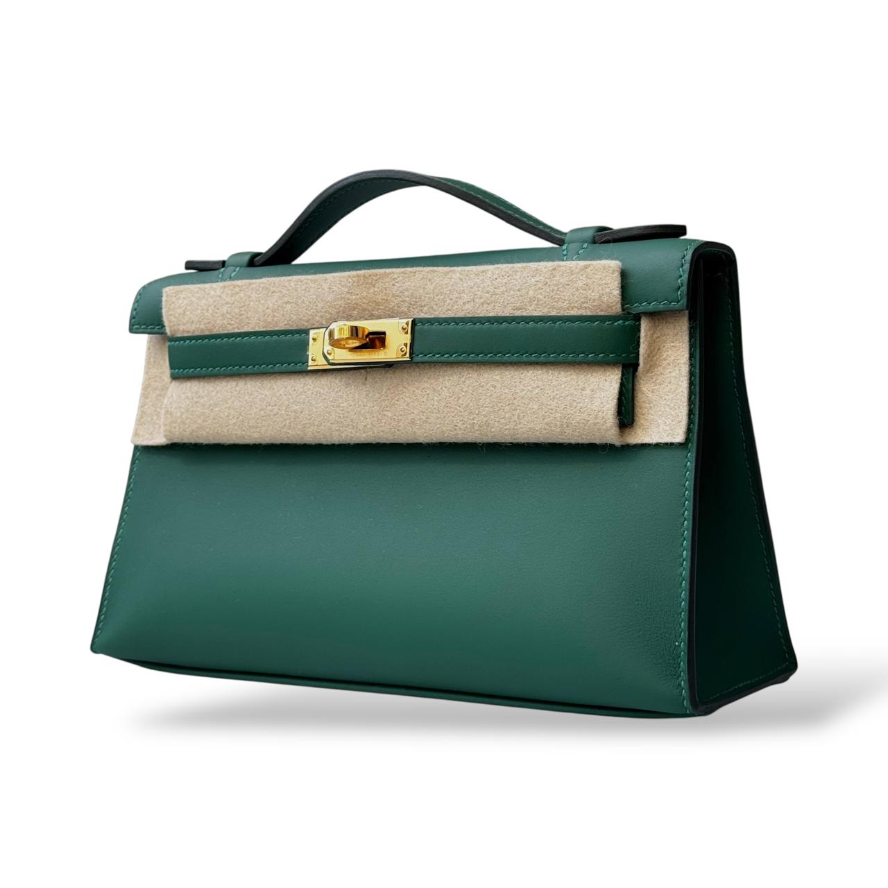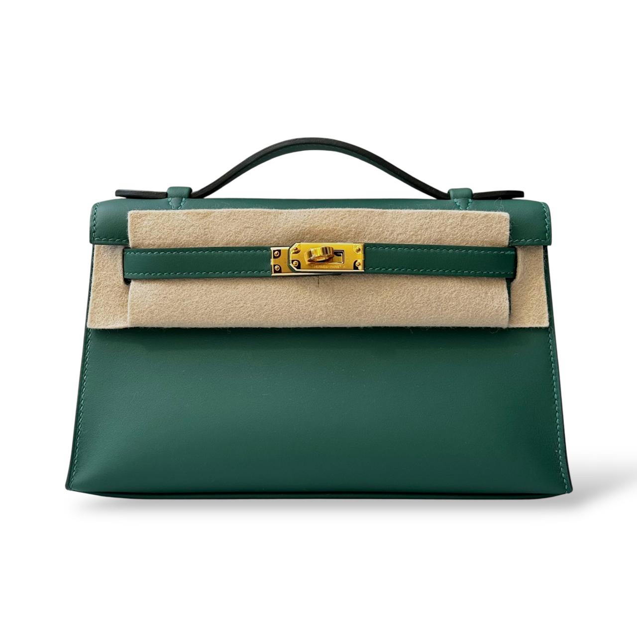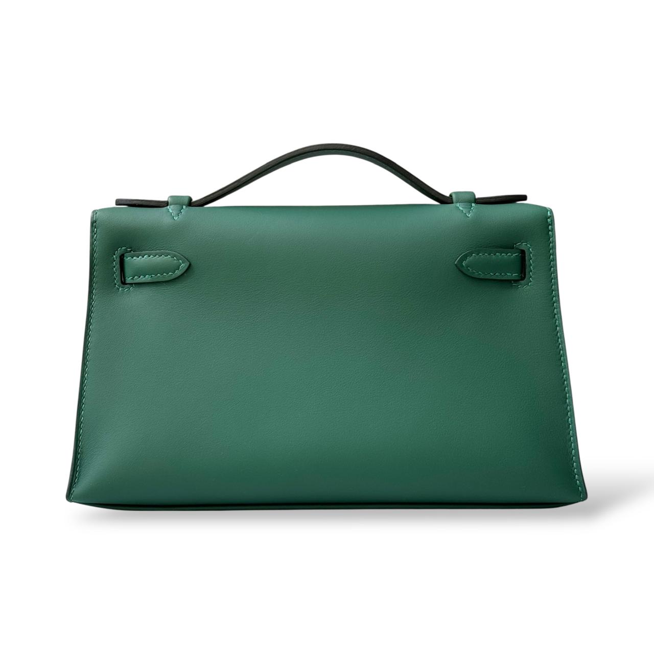 The Hermès Kelly Pochette in Vert Moyen is a timeless and elegant clutch crafted from smooth Swift leather. Its rich green shade paired with gold hardware adds a sophisticated and luxurious touch. Compact yet statement-making, it’s perfect for both evening occasions and chic daytime styling.