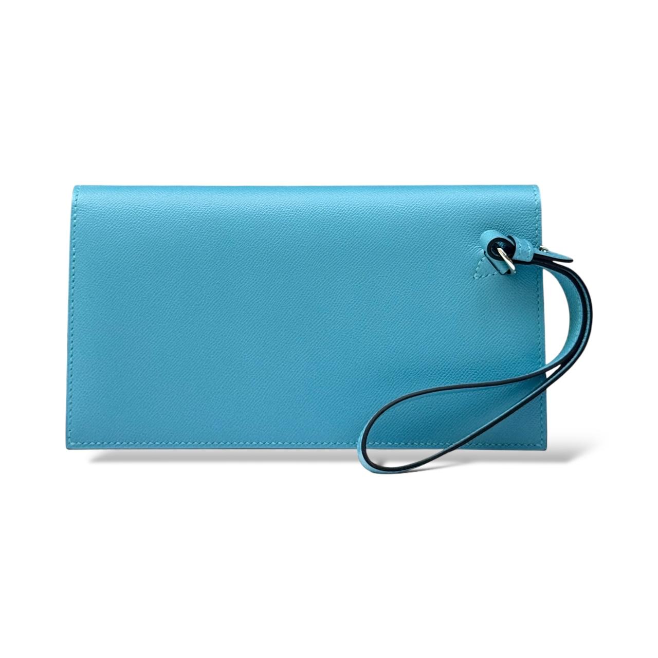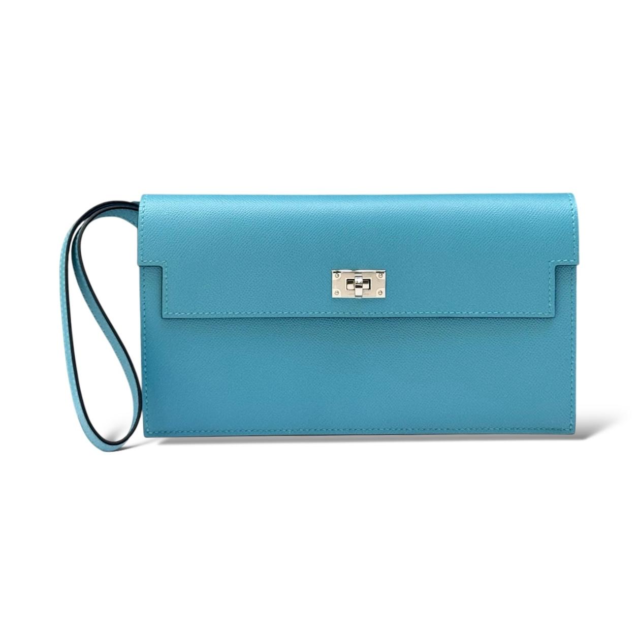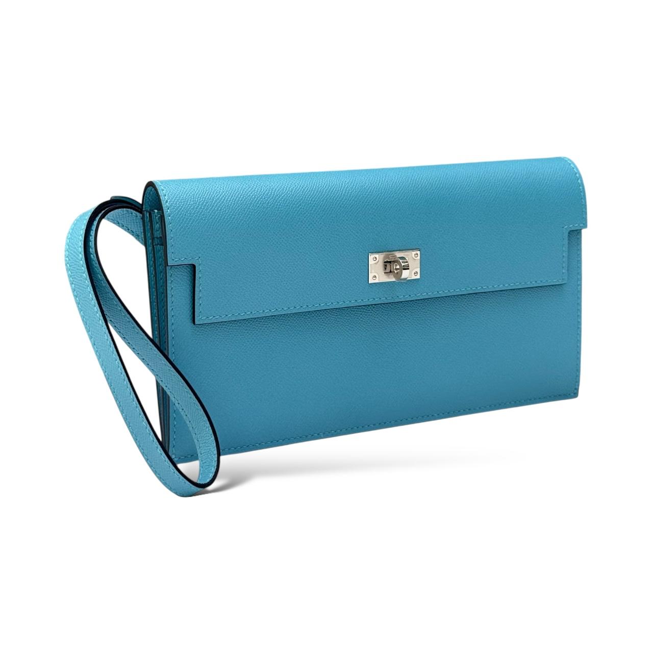 A refined and functional wallet crafted from luxurious Madame calfskin in the elegant Bleu Du Nord shade. Inspired by the iconic Kelly bag, it features the signature Kelly lock in Palladium hardware (PHW), multiple card slots, and an exterior pocket for added convenience. A timeless blend of sophistication and utility.