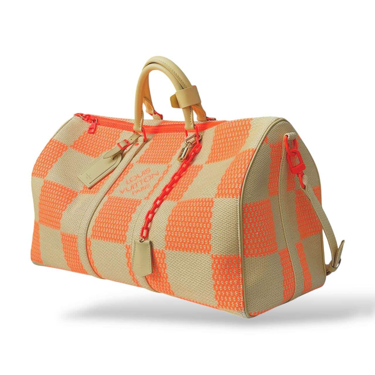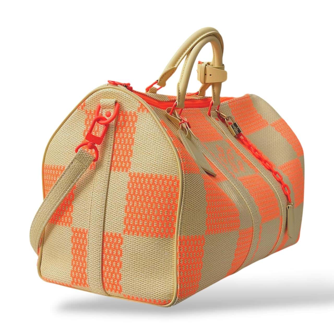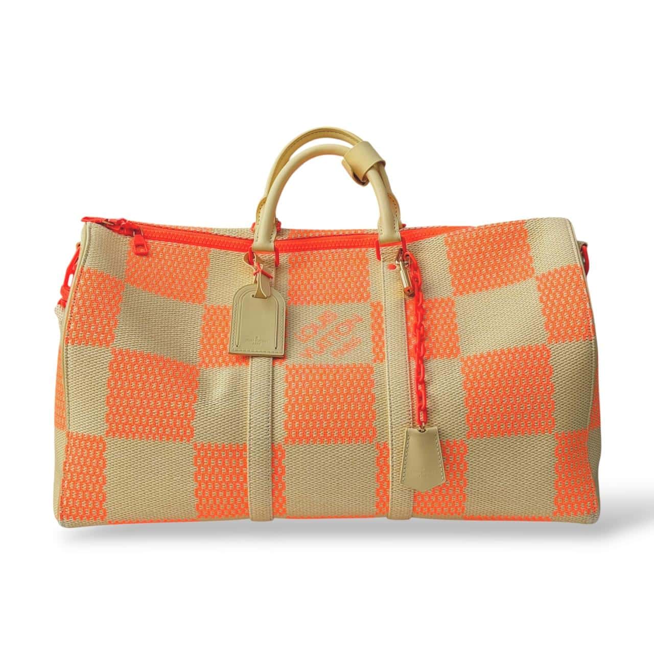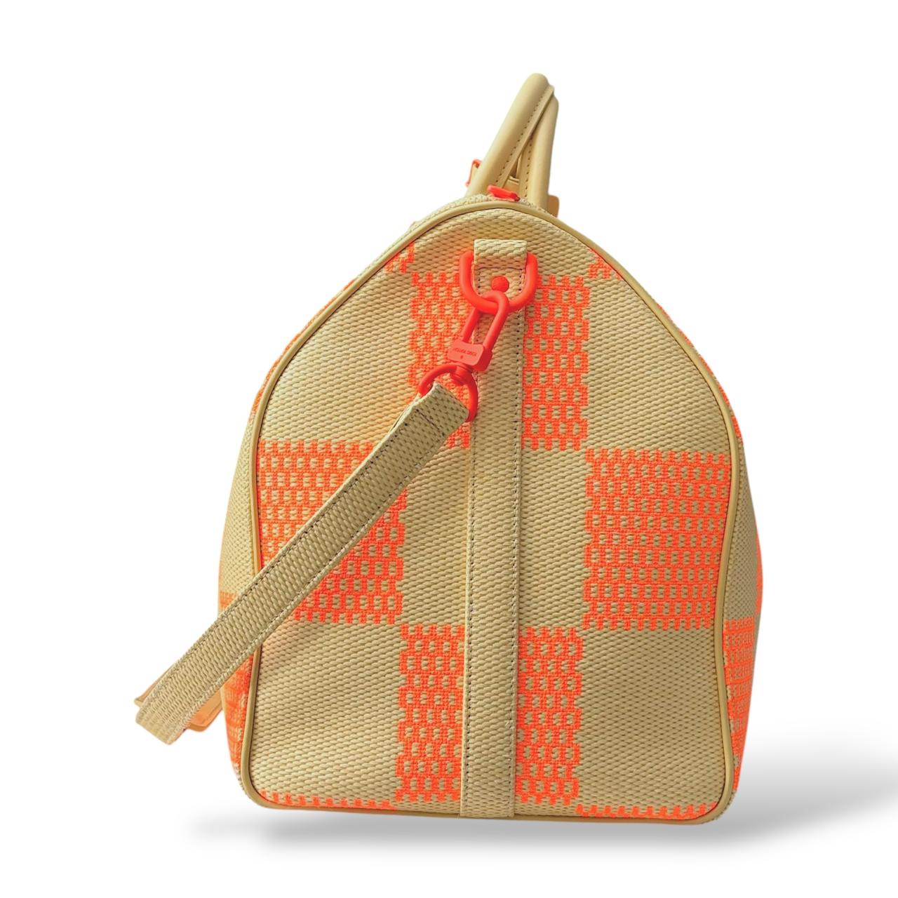 Louis Vuitton Damier Giant Keepall Bandoulière 50 in orange and beige canvas. A bold travel bag featuring oversized Damier checks, premium leather trim, rolled handles, and a detachable shoulder strap—spacious, stylish, and perfect for weekend or carry-on travel.