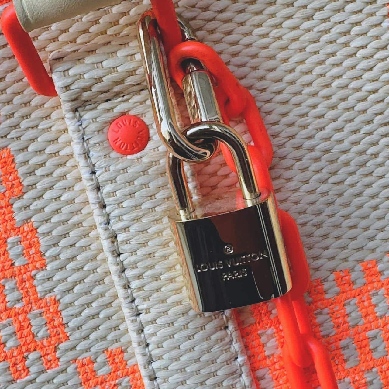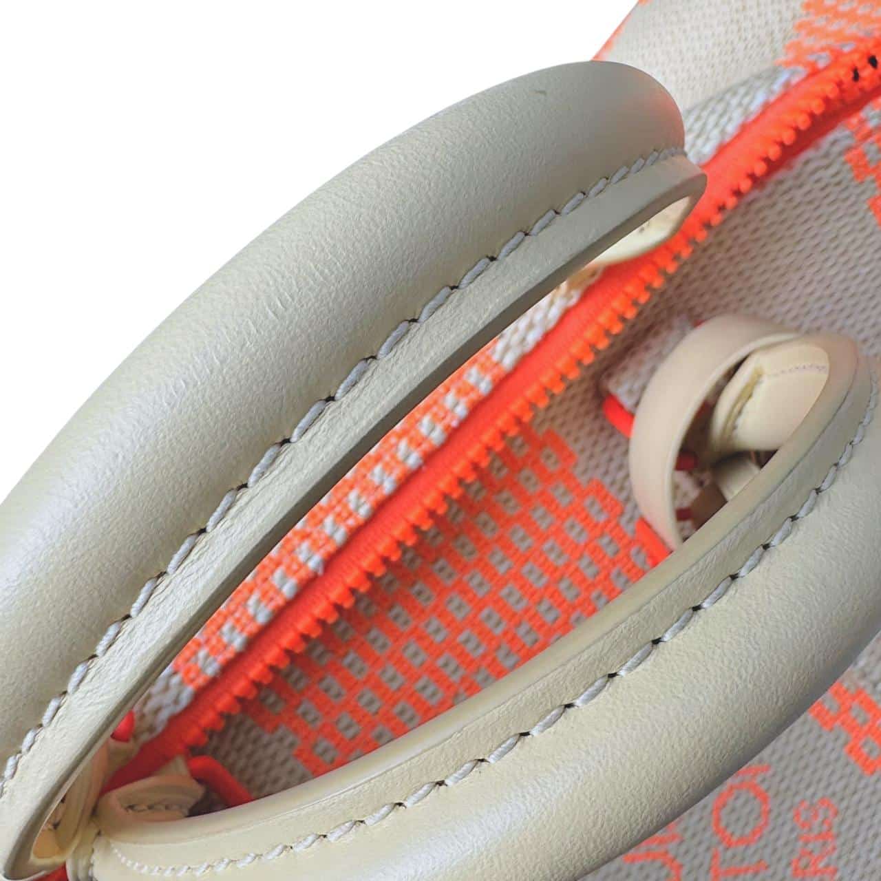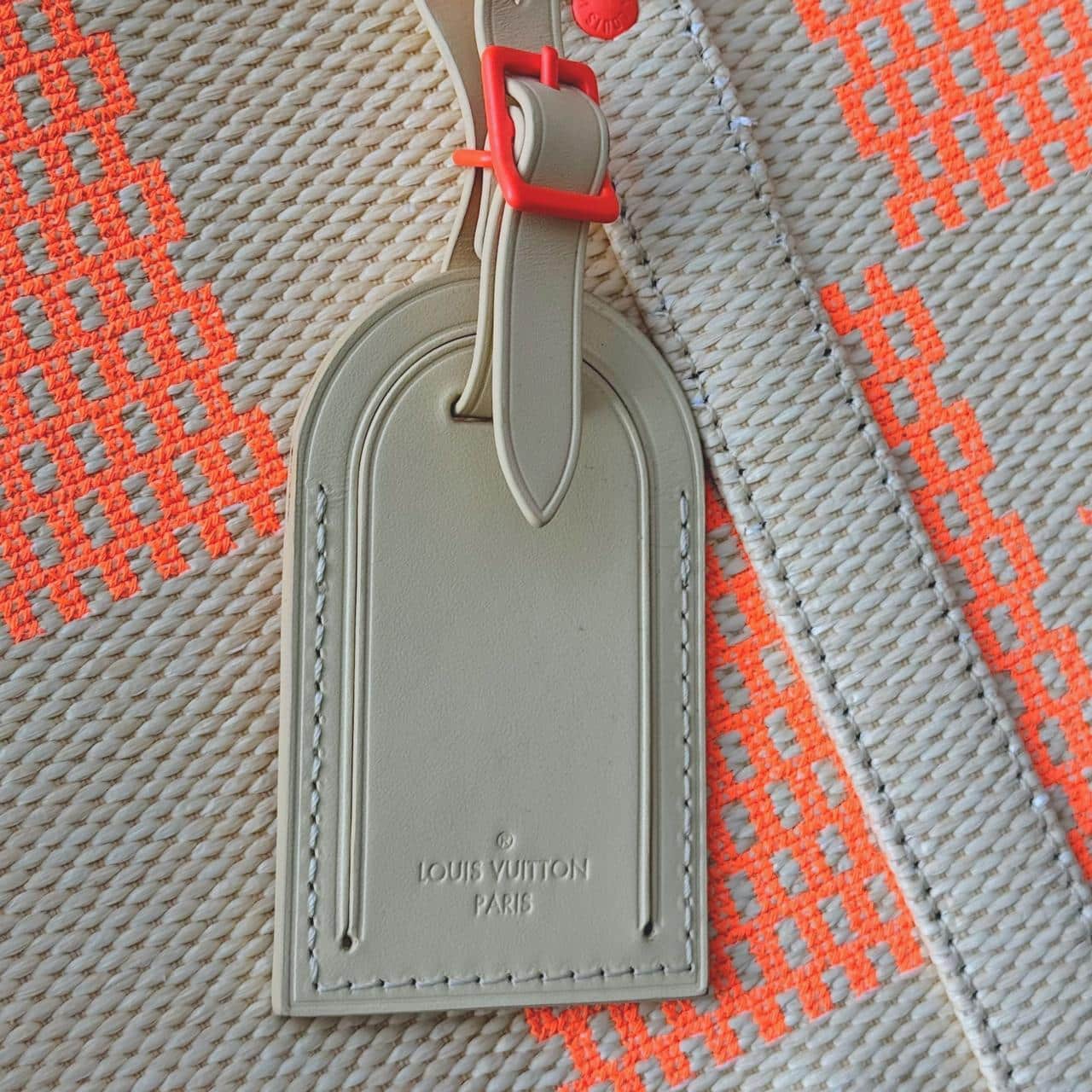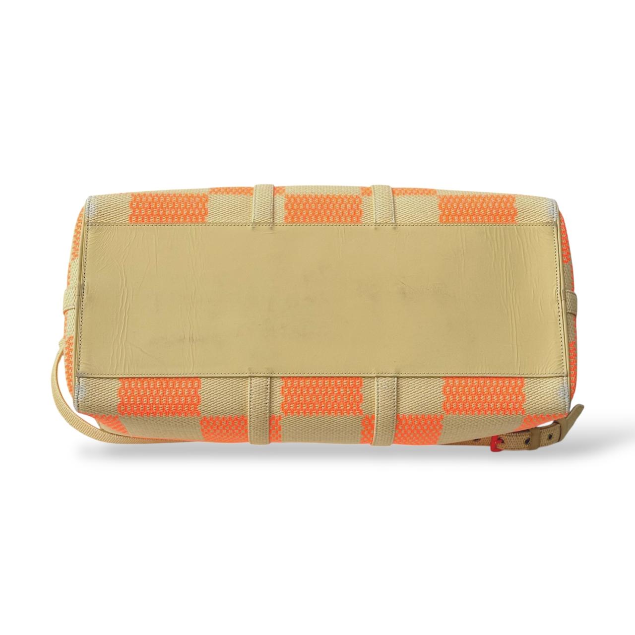 Louis Vuitton Damier Giant Keepall Bandoulière 50 in orange and beige canvas. A bold travel bag featuring oversized Damier checks, premium leather trim, rolled handles, and a detachable shoulder strap—spacious, stylish, and perfect for weekend or carry-on travel.
