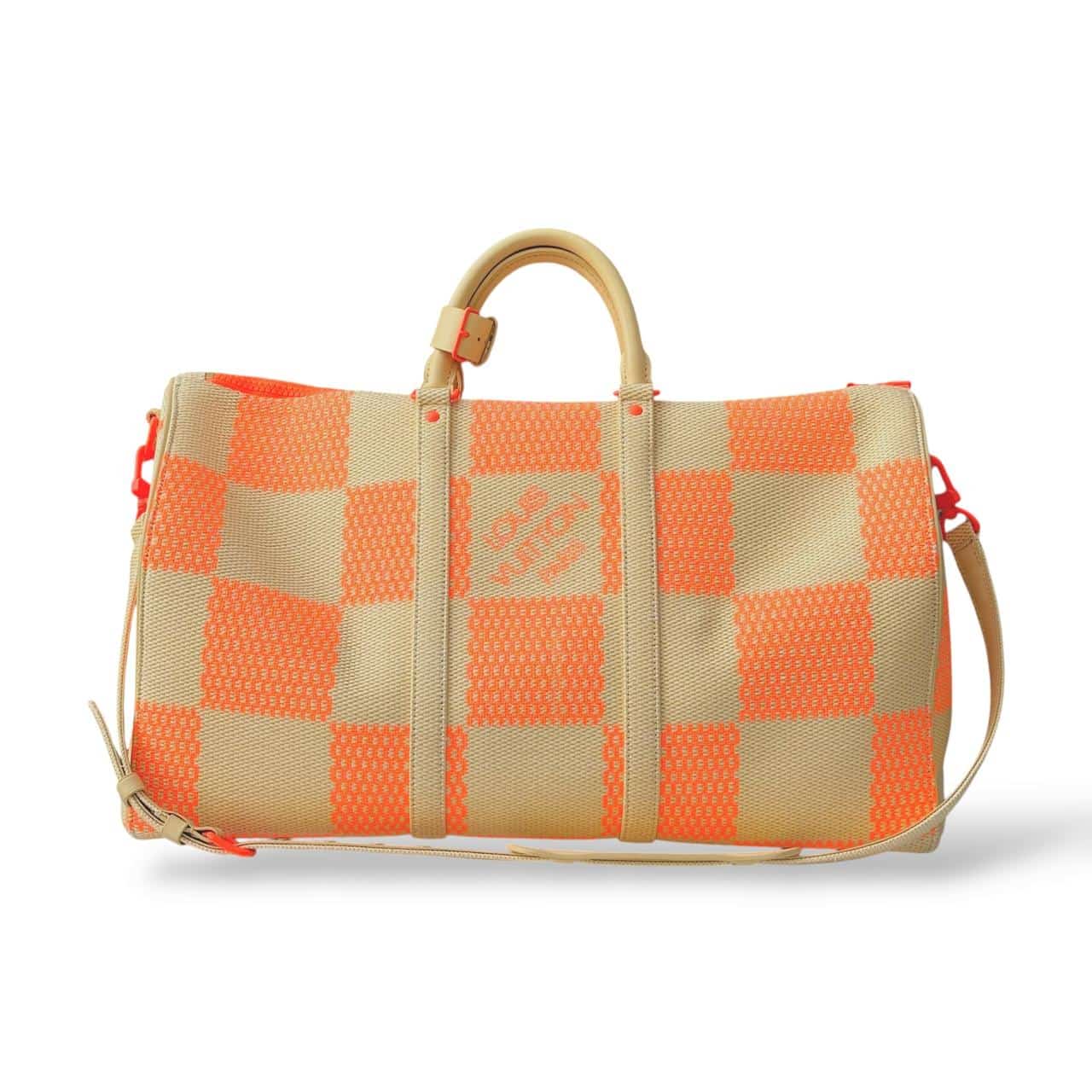 Louis Vuitton Damier Giant Keepall Bandoulière 50 in orange and beige canvas. A bold travel bag featuring oversized Damier checks, premium leather trim, rolled handles, and a detachable shoulder strap—spacious, stylish, and perfect for weekend or carry-on travel.