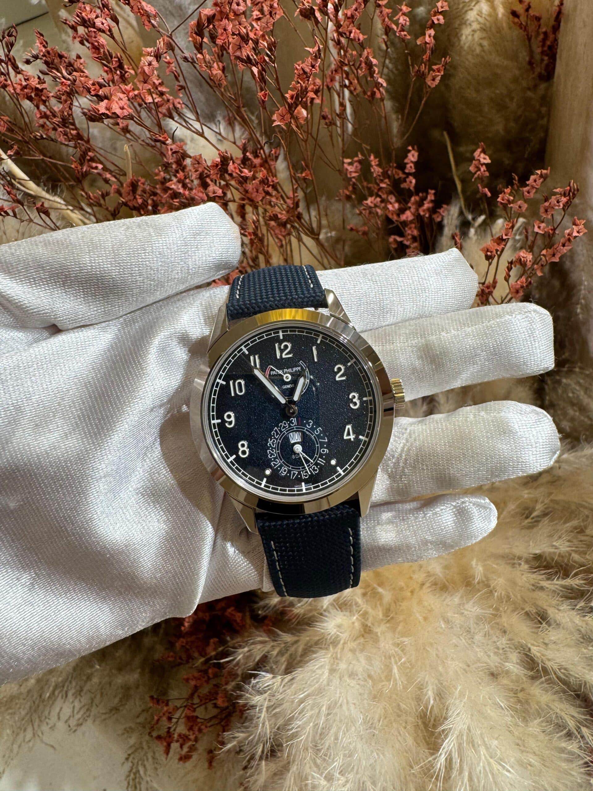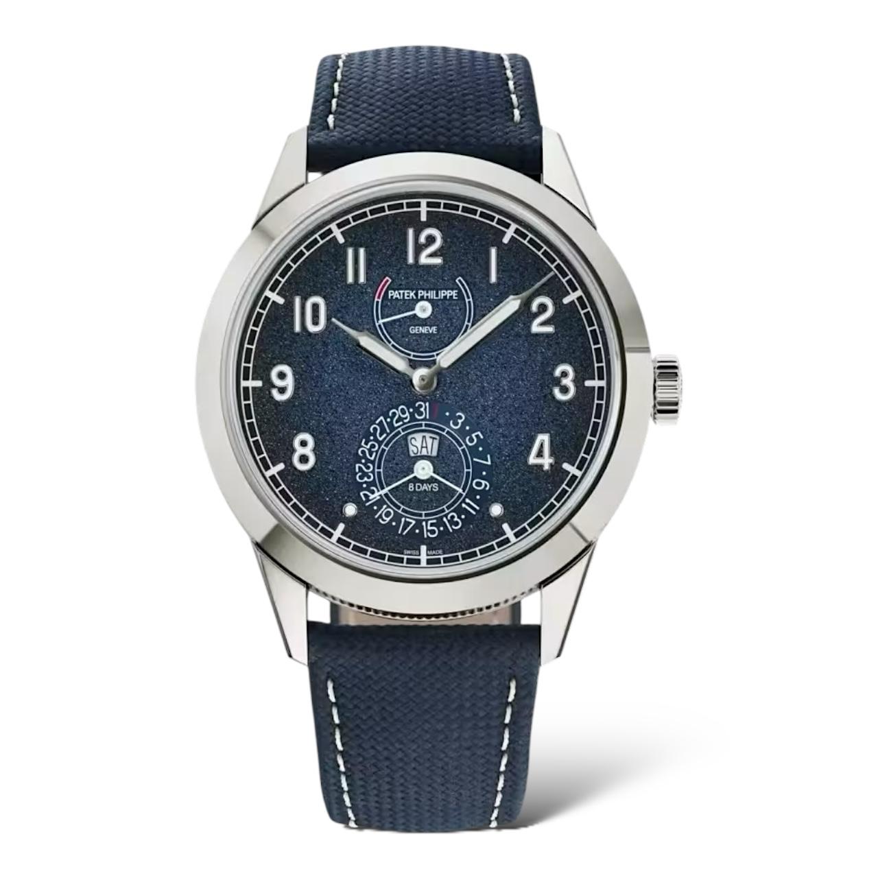 The Patek Philippe 5328G-001 is a 41mm white gold Calatrava featuring a navy-blue textured dial with luminescent Arabic numerals. It houses a manual-wind movement with an 8-day power reserve, instantaneous day and date display, and a power reserve indicator. The case features a Clous de Paris guilloché pattern, and the watch is paired with a navy-blue calfskin strap and an extra taupe strap. Elegant and technically advanced, it blends traditional design with modern horological innovation.
