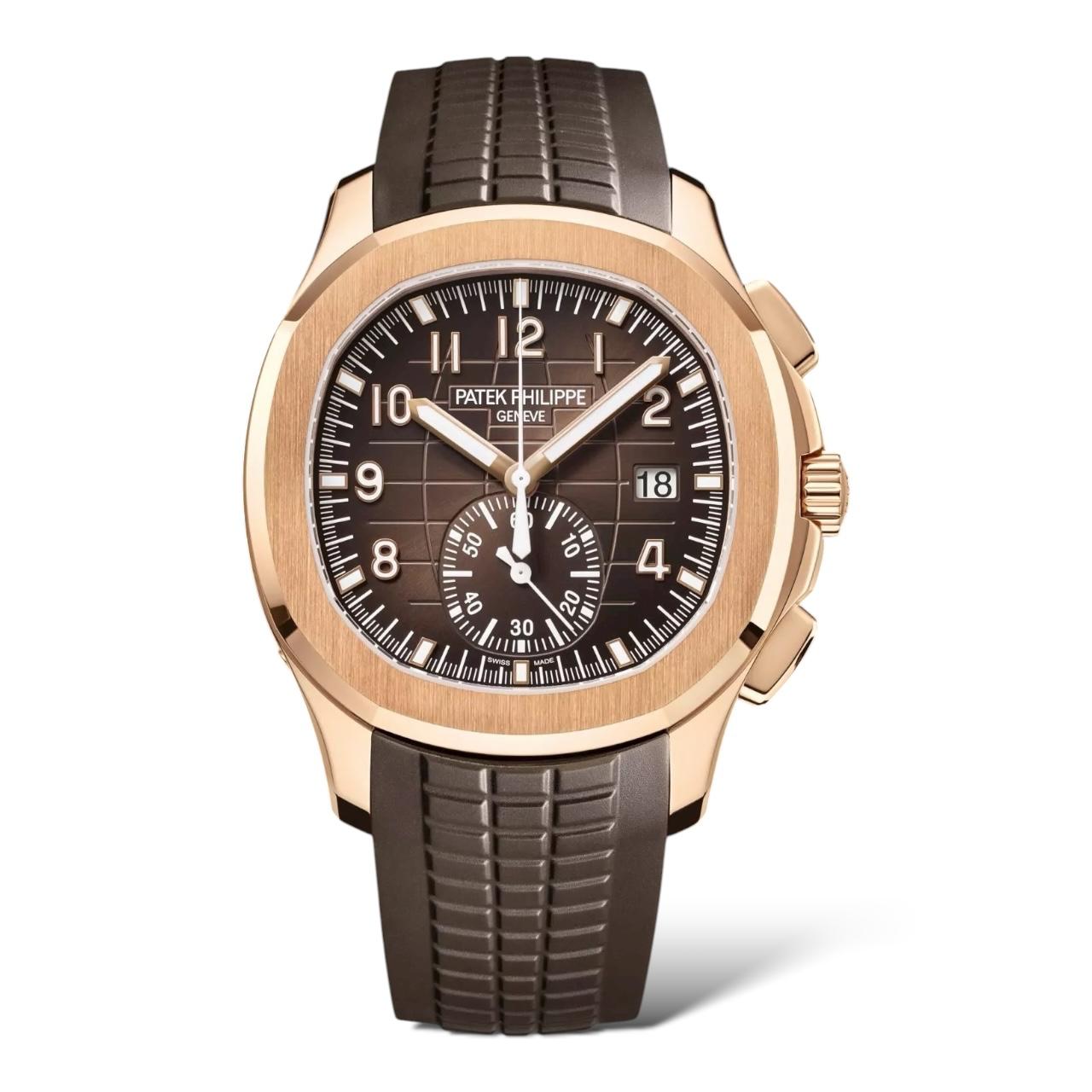 Patek Philippe has reinforced the “contemporary sporty chic” spirit of the Aquanaut automatic flyback chronograph with a rose gold version featuring a brown sunburst dial with a black-gradient rim and a matching composite strap. The chronograph’s central second hand can also be used to provide a running seconds display.