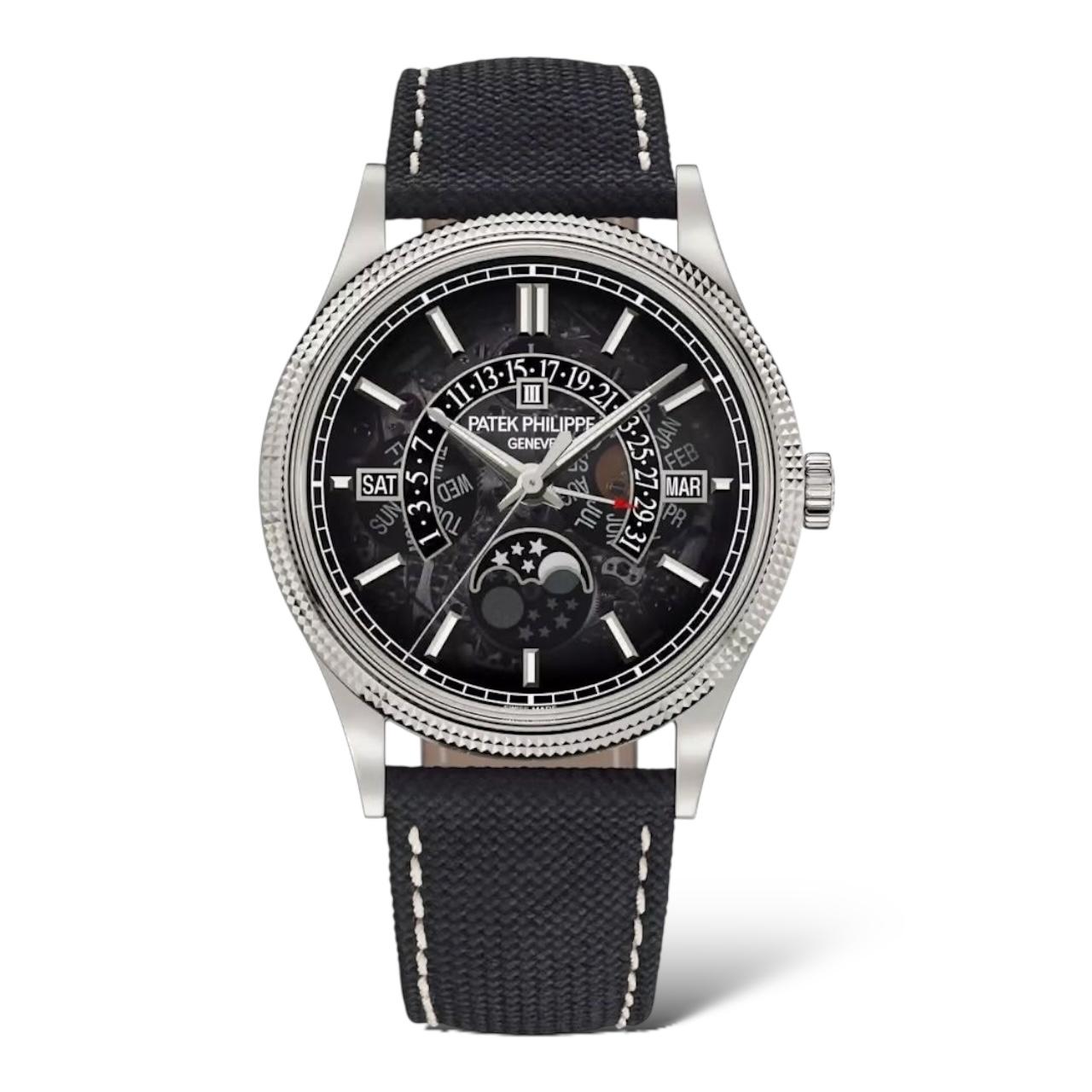 Patek Philippe reinterprets its perpetual calendar with retrograde date hand in this white gold version exuding an original, contemporary style. The gray metallized sapphire crystal dial reveals the watch’s mechanical heart. The bezel and the caseback are enhanced by the guilloché hobnail pattern, one of the finest emblems of Patek Philippe style.
