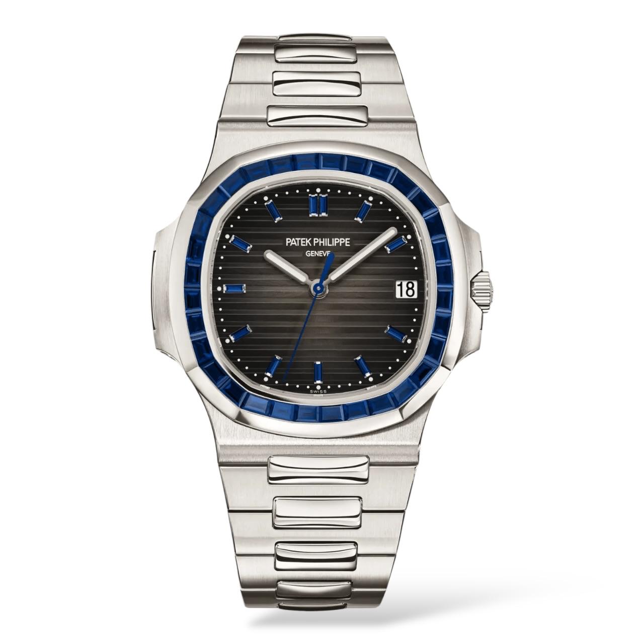 This jewelry version of the Nautilus is notable for its platinum case and octagonal bezel set with 32 baguette-cut sapphires (4 cts). The sunburst charcoal gray dial with black-gradient rim and embossed horizontal motif reinforces the sporty elegance of this iconic design powered by self-winding caliber 26-330 S C.