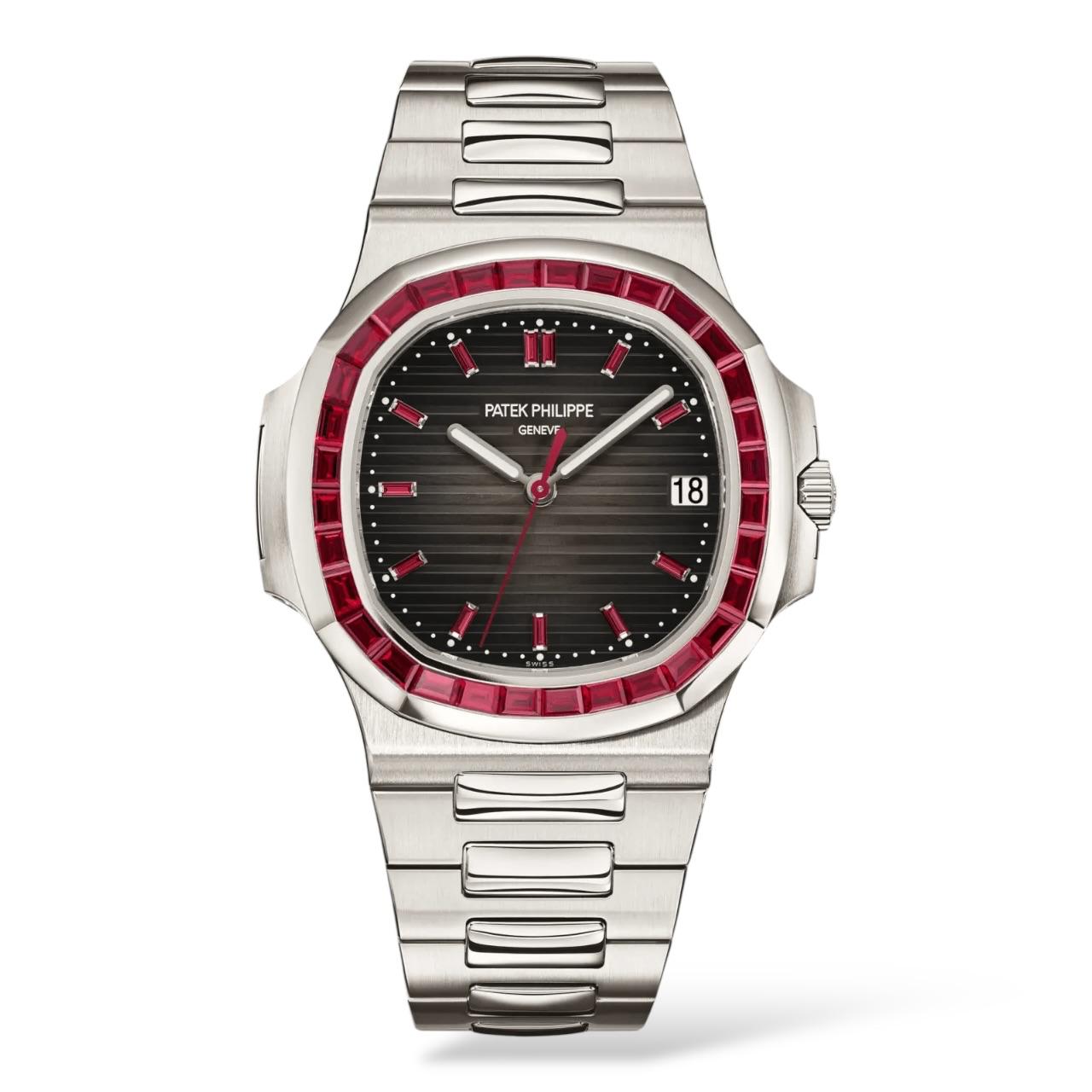 This jewelry version of the Nautilus is notable for its platinum case and octagonal bezel set with 32 baguette-cut rubies (4 cts). The sunburst charcoal dial with black-gradient rim and embossed horizontal motif reinforces the sporty elegance of this iconic design powered by self-winding caliber 26-330 S C.