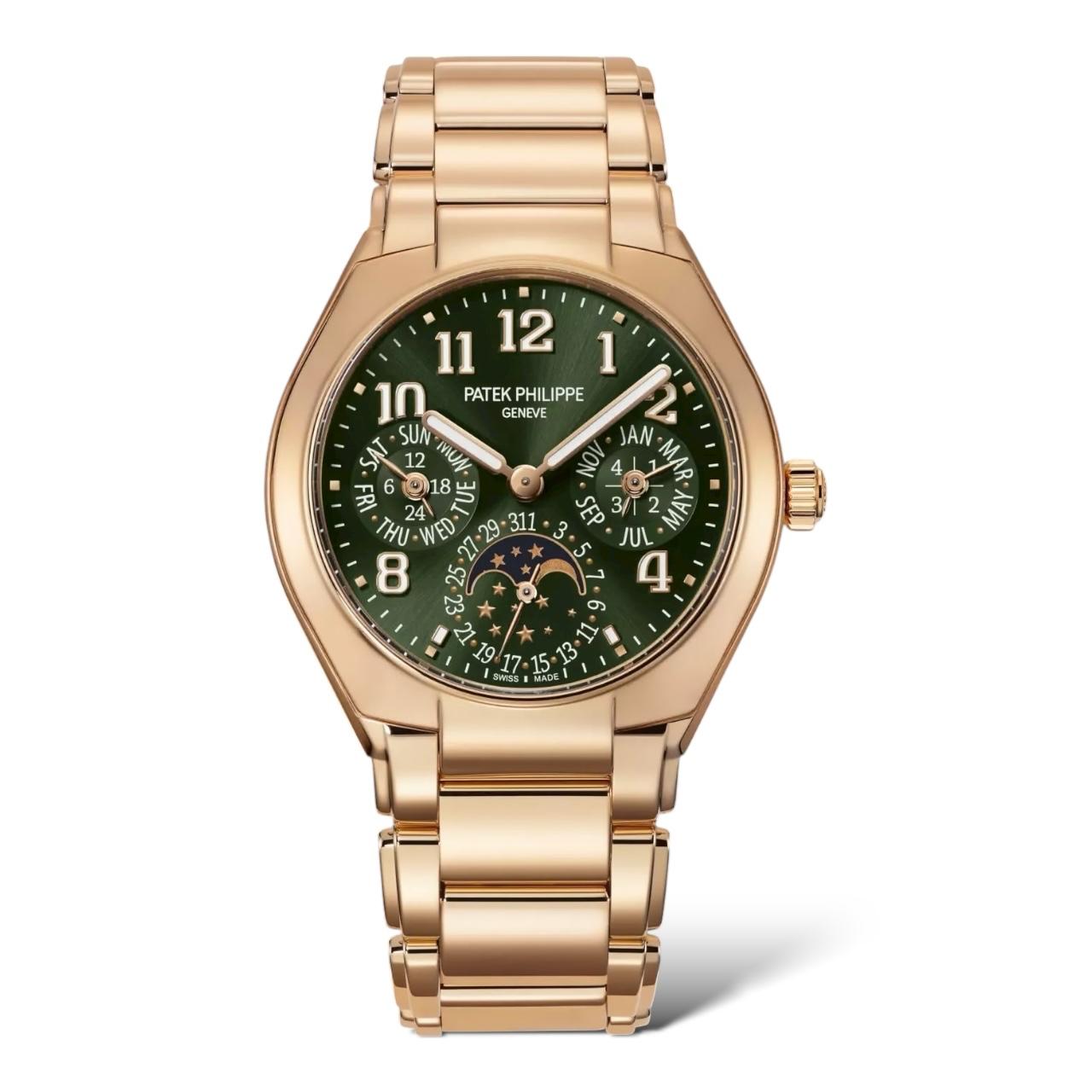 An elegant Grand Complication with its day/date/month displays by hands complemented by a moon-phase aperture, this self-winding Twenty~4 presents one of the most recognizable faces among Patek Philippe perpetual calendars. The rose gold case and bracelet are set off by a dial attired in an elegant sunburst olive green color that is both subtle and modern.