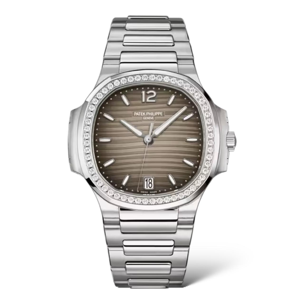 This elegant 35.2 mm stainless steel Nautilus features a gray opaline dial with a black-gradient rim, set within a diamond-bezel (56 diamonds ~0.71 ct). Driven by the caliber 26-330 S C automatic movement, it offers date and sweep-seconds functions. The steel bracelet includes a fold-over clasp with a length adjustment system, combining sporty sophistication with refined luxury.
