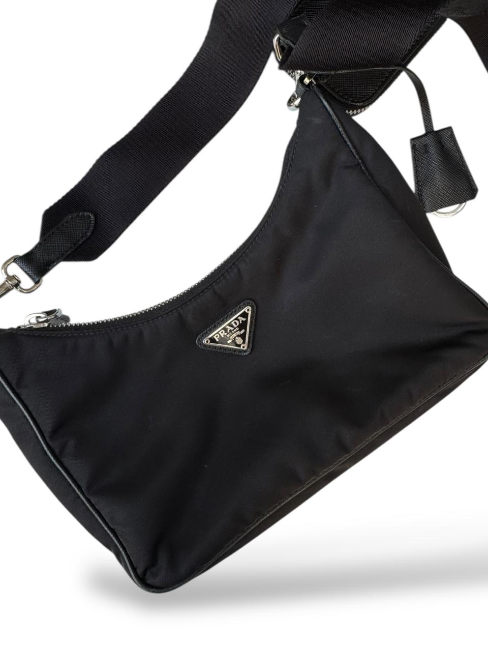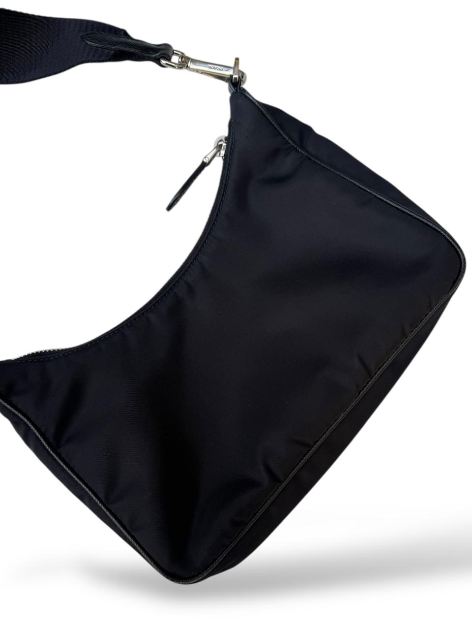 Prada Re-Edition 2005 Re-Nylon Black Bag is a modern revival of Prada’s early 2000s mini hobo-style shoulder bag, crafted from Prada’s signature Re-Nylon (recycled nylon) for sustainable luxury with black Saffiano leather trim and an enamelled triangular logo. It features a zip-top closure, detachable/adjustable strap and compact silhouette that’s perfect for everyday essentials — blending Y2K nostalgia with contemporary versatility.