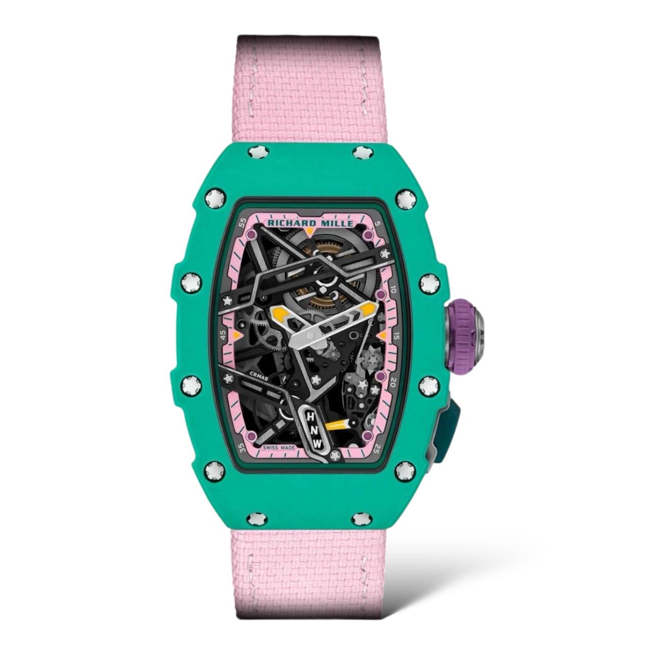 The Richard Mille RM 07-04 in Pink and Green combines cutting-edge design with luxury craftsmanship. Its lightweight Quartz TPT® case and skeletonized movement ensure durability and precision. Bold yet elegant, this timepiece is a perfect blend of performance and style.